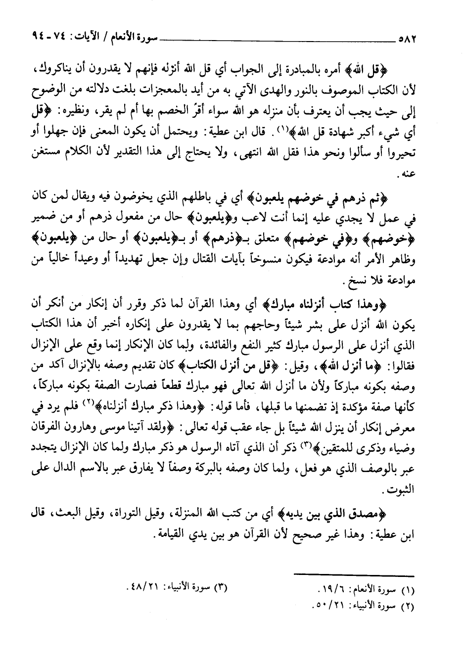 ثُمَّ ذَرْهُمْ فِي خَوْضِهِمْ يَلْعَبُونَ أَيْ فِي بَاطِلِهِمُ الَّذِي يَخُوضُونَ فِيهِ وَيُقَالُ لِمَنْ كَانَ فِي عَمَلٍ لَا يُجْدِي عَلَيْهِ إِنَّمَا أنت لاعب ويَلْعَبُونَ حَالٌ مِنْ مَفْعُولِ ذَرْهُمْ أَوْ مِنْ ضَمِيرِ خَوْضِهِمْ وفِي خَوْضِهِمْ مُتَعَلِّقٌ بِ ذَرْهُمْ أَوْ بِ يَلْعَبُونَ أَوْ حَالٌ مِنْ يَلْعَبُونَ وَظَاهِرُ الْأَمْرِ أَنَّهُ مُوَادَعَةٌ فَيَكُونُ مَنْسُوخًا بِآيَاتِ الْقِتَالِ وَإِنْ جُعِلَ تَهْدِيدًا أَوْ وَعِيدًا خَالِيًا مِنْ مُوَادَعَةٍ فَلَا نَسْخَ.