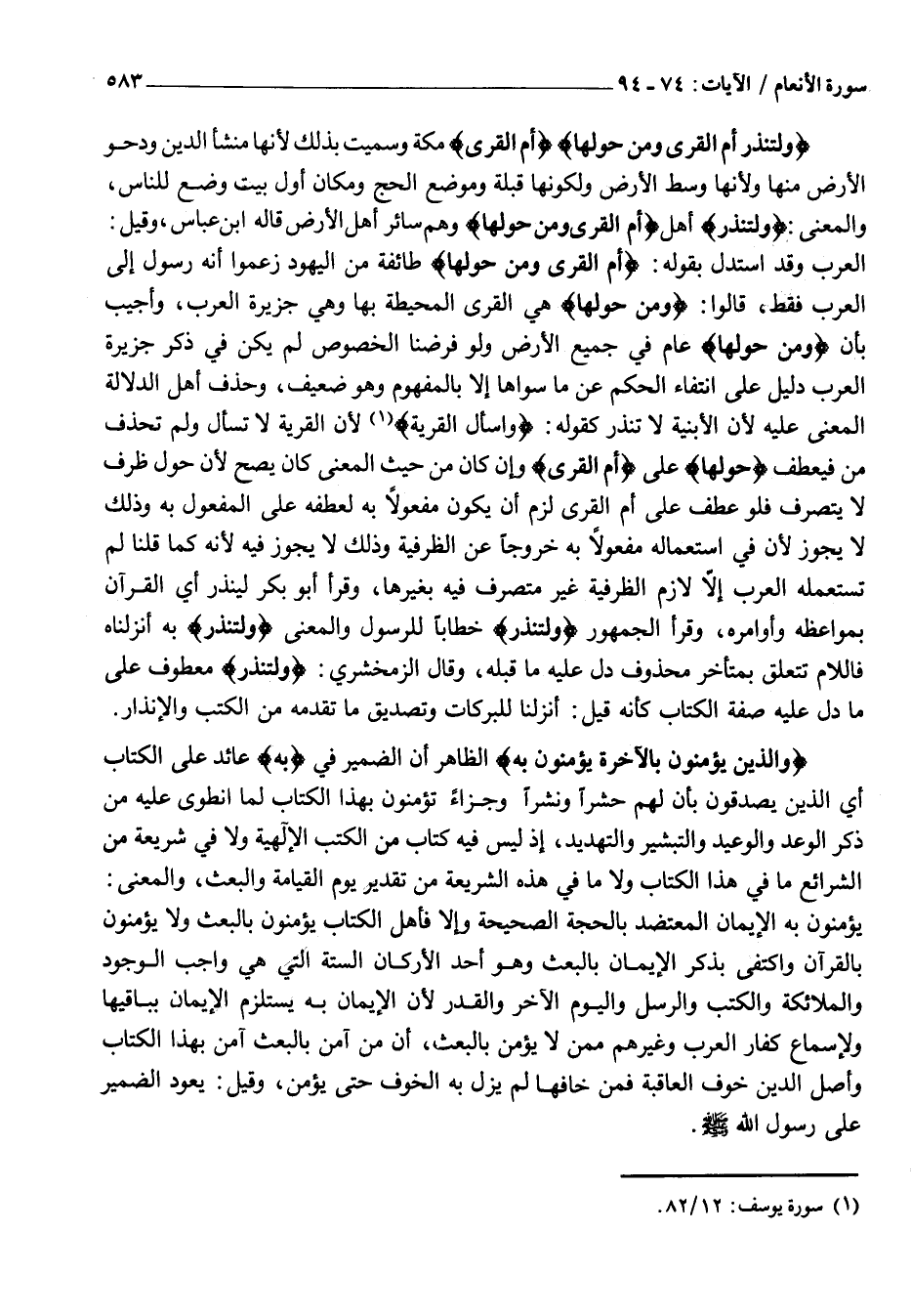 وَلِتُنْذِرَ أُمَّ الْقُرى وَمَنْ حَوْلَها أُمَّ الْقُرى مَكَّةُ وَسُمِّيَتْ بِذَلِكَ لِأَنَّهَا مَنْشَأُ الدين ودحو الْأَرْضِ مِنْهَا وَلِأَنَّهَا وَسَطُ الْأَرْضِ وَلِكَوْنِهَا قِبْلَةَ وَمَوْضِعَ الْحَجِّ وَمَكَانَ أَوَّلِ بَيْتٍ وَضِعَ لِلنَّاسِ، وَالْمَعْنَى: وَلِتُنْذِرَ أَهْلَ أُمَّ الْقُرى وَمَنْ حَوْلَها وَهُمْ سَائِرُ أَهْلِ الْأَرْضِ قَالَهُ ابْنُ عَبَّاسٍ، وَقِيلَ: