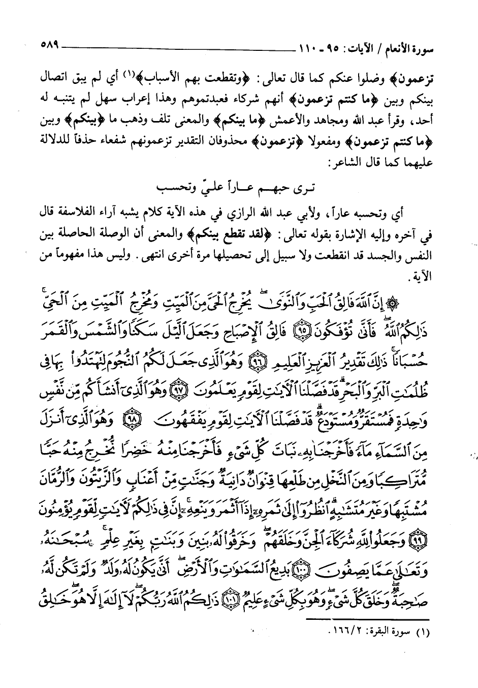 إِنَّ اللَّهَ فالِقُ الْحَبِّ وَالنَّوى يُخْرِجُ الْحَيَّ مِنَ الْمَيِّتِ وَمُخْرِجُ الْمَيِّتِ مِنَ الْحَيِّ ذلِكُمُ اللَّهُ فَأَنَّى تُؤْفَكُونَ (95) فالِقُ الْإِصْباحِ وَجَعَلَ اللَّيْلَ سَكَناً وَالشَّمْسَ وَالْقَمَرَ حُسْباناً ذلِكَ تَقْدِيرُ الْعَزِيزِ الْعَلِيمِ (96) وَهُوَ الَّذِي جَعَلَ لَكُمُ النُّجُومَ لِتَهْتَدُوا بِها فِي ظُلُماتِ الْبَرِّ وَالْبَحْرِ قَدْ فَصَّلْنَا الْآياتِ لِقَوْمٍ يَعْلَمُونَ (97) وَهُوَ الَّذِي أَنْشَأَكُمْ مِنْ نَفْسٍ واحِدَةٍ فَمُسْتَقَرٌّ وَمُسْتَوْدَعٌ قَدْ فَصَّلْنَا الْآياتِ لِقَوْمٍ يَفْقَهُونَ (98) وَهُوَ الَّذِي أَنْزَلَ مِنَ السَّماءِ مَاءً فَأَخْرَجْنا بِهِ نَباتَ كُلِّ شَيْءٍ فَأَخْرَجْنا مِنْهُ خَضِراً نُخْرِجُ مِنْهُ حَبًّا مُتَراكِباً وَمِنَ النَّخْلِ مِنْ طَلْعِها قِنْوانٌ دانِيَةٌ وَجَنَّاتٍ مِنْ أَعْنابٍ وَالزَّيْتُونَ وَالرُّمَّانَ مُشْتَبِهاً وَغَيْرَ مُتَشابِهٍ انْظُرُوا إِلى ثَمَرِهِ إِذا أَثْمَرَ وَيَنْعِهِ إِنَّ فِي ذلِكُمْ لَآياتٍ لِقَوْمٍ يُؤْمِنُونَ (99)