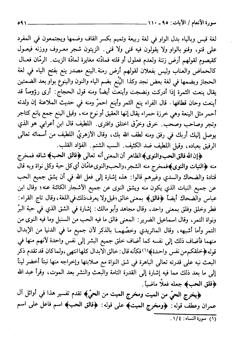 إِنَّ اللَّهَ فالِقُ الْحَبِّ وَالنَّوى الظَّاهِرُ أَنَّ الْمَعْنَى أَنَّهُ تَعَالَى فالِقُ الْحَبِّ شَاقُّهُ فَمُخْرَجٌ مِنْهُ النَّبَاتَ وَالنَّوَى فَمُخْرَجٌ مِنْهُ الشَّجَرَ، وَالْحَبُّ وَالنَّوَى عَامَّانِ أَيْ كُلُّ حَبَّةِ وَكُلُّ نَوَاةٍ وَبِهِ قَالَ قَتَادَةُ وَالضَّحَّاكُ وَالسُّدِّيُّ وَغَيْرُهُمْ قَالُوا: هَذِهِ إِشَارَةٌ إِلَى فِعْلِ اللَّهِ فِي أَنْ يَشُقَّ جَمِيعَ الْحَبِّ عَنْ جَمِيعِ النَّبَاتِ الَّذِي يَكُونُ مِنْهُ وَيَشُقَّ النَّوَى عَنْ جَمِيعِ الْأَشْجَارِ الْكَائِنَةِ عَنْهُ وَقَالَ ابْنُ عَبَّاسٍ وَالضَّحَّاكُ أَيْضًا فالِقُ بِمَعْنَى خَالِقٍ قِيلَ وَلَا يُعْرَفُ ذَلِكَ فِي اللُّغَةِ، وَقَالَ تَاجُ الْقُرَّاءِ:
