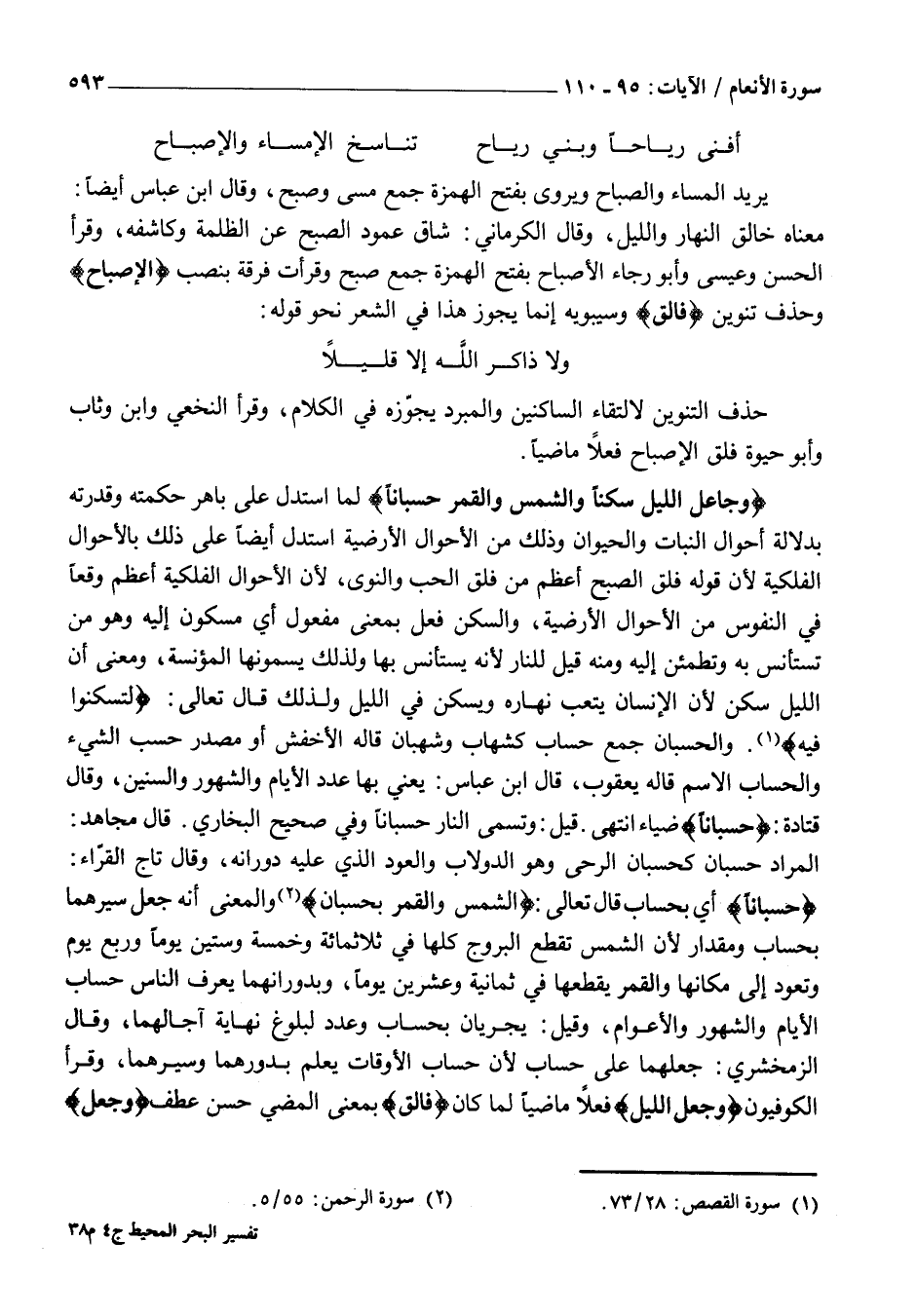 وَجَعَلَ اللَّيْلَ سَكَناً وَالشَّمْسَ وَالْقَمَرَ حُسْباناً لَمَّا اسْتَدَلَّ عَلَى بَاهِرِ حِكْمَتِهِ وَقُدْرَتِهِ بِدَلَالَةِ أَحْوَالِ النَّبَاتِ وَالْحَيَوَانِ وَذَلِكَ مِنَ الْأَحْوَالِ الْأَرْضِيَّةِ اسْتَدَلَّ أَيْضًا عَلَى ذَلِكَ بِالْأَحْوَالِ الْفَلَكِيَّةِ لِأَنَّ قَوْلَهُ فَلَقَ الصُّبْحَ أَعْظَمُ مِنْ فَلْقِ الْحَبِّ وَالنَّوَى، لِأَنَّ الْأَحْوَالَ الْفَلَكِيَّةَ أَعْظَمُ وَقْعًا فِي النُّفُوسِ مِنَ الْأَحْوَالِ الْأَرْضِيَّةِ، وَالسَّكَنُ فِعْلٌ بِمَعْنَى مَفْعُولٍ أَيِ مَسْكُونٍ إِلَيْهِ وَهُوَ مَنْ تَسْتَأْنِسُ بِهِ وَتَطْمَئِنُّ إِلَيْهِ وَمِنْهُ قِيلَ لِلنَّارِ لِأَنَّهُ يُسْتَأْنَسُ بِهَا وَلِذَلِكَ يُسَمُّونَهَا الْمُؤْنِسَةَ، وَمَعْنَى أَنَّ اللَّيْلَ سَكَنٌ لِأَنَّ الْإِنْسَانَ يَتْعَبُ نَهَارَهُ وَيَسْكُنُ فِي اللَّيْلِ وَلِذَلِكَ قَالَ تَعَالَى: لِتَسْكُنُوا فِيهِ «1» . وَالْحُسْبَانُ جَمْعُ حِسَابٍ كَشِهَابٍ وَشُهْبَانٍ قَالَهُ الْأَخْفَشُ أَوْ مَصْدَرُ حَسَبَ الشَّيْءَ وَالْحِسَابُ الِاسْمُ قَالَهُ يَعْقُوبُ، قَالَ ابْنُ عَبَّاسٍ: يَعْنِي بِهَا عَدَدَ الْأَيَّامِ وَالشُّهُورِ وَالسِّنِينَ، وَقَالَ قَتَادَةُ: حُسْباناً ضِيَاءً انْتَهَى. قِيلَ: وَتُسَمَّى النَّارُ حُسْبَانًا وَفِي صَحِيحِ الْبُخَارِيِّ. قَالَ مُجَاهِدٌ: