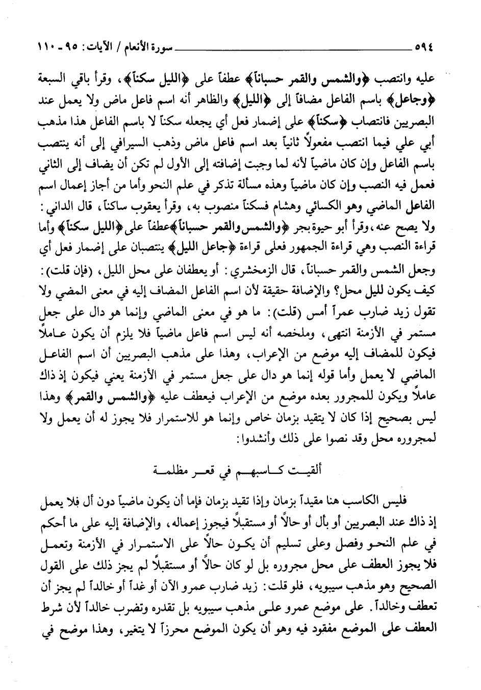 كَيْفَ يَكُونُ لِلَّيْلِ مَحَلٌّ؟ وَالْإِضَافَةُ حَقِيقَةٌ لِأَنَّ اسْمَ الْفَاعِلِ الْمُضَافَ إِلَيْهِ فِي مَعْنَى الْمُضِيِّ وَلَا تَقُولُ زِيدٌ ضَارِبٌ عَمْرًا أَمْسِ (قُلْتُ) : مَا هُوَ فِي مَعْنَى الْمَاضِي وَإِنَّمَا هُوَ دَالٌّ عَلَى جَعْلٍ مُسْتَمِرٍّ فِي الْأَزْمِنَةِ انْتَهَى، وَمُلَخَّصُهُ أَنَّهُ لَيْسَ اسْمَ فَاعِلٍ مَاضِيًا فَلَا يَلْزَمُ أَنْ يَكُونَ عَامِلًا فَيَكُونُ لِلْمُضَافِ إِلَيْهِ مَوْضِعٌ مِنَ الْإِعْرَابِ، وَهَذَا عَلَى مَذْهَبِ الْبَصْرِيِّينَ أَنَّ اسْمَ الْفَاعِلِ الْمَاضِيَ لَا يَعْمَلَ وَأَمَّا قَوْلُهُ إِنَّمَا هُوَ دَالٌّ عَلَى جَعْلٍ مُسْتَمِرٍّ فِي الْأَزْمِنَةِ يَعْنِي فَيَكُونُ إِذْ ذَاكَ عَامِلًا وَيَكُونُ لِلْمَجْرُورِ بَعْدَهُ مَوْضِعٌ مِنَ الْإِعْرَابِ فَيُعْطَفُ عَلَيْهِ وَالشَّمْسَ وَالْقَمَرَ وَهَذَا لَيْسَ بِصَحِيحٍ إِذَا كَانَ لَا يَتَقَيَّدُ بِزَمَانٍ خَاصٍّ وَإِنَّمَا هُوَ لِلِاسْتِمْرَارِ فَلَا يَجُوزُ لَهُ أَنْ يَعْمَلَ وَلَا لِمَجْرُورِهِ مَحَلٌّ وَقَدْ نَصُّوا عَلَى ذَلِكَ وَأَنْشَدُوا: