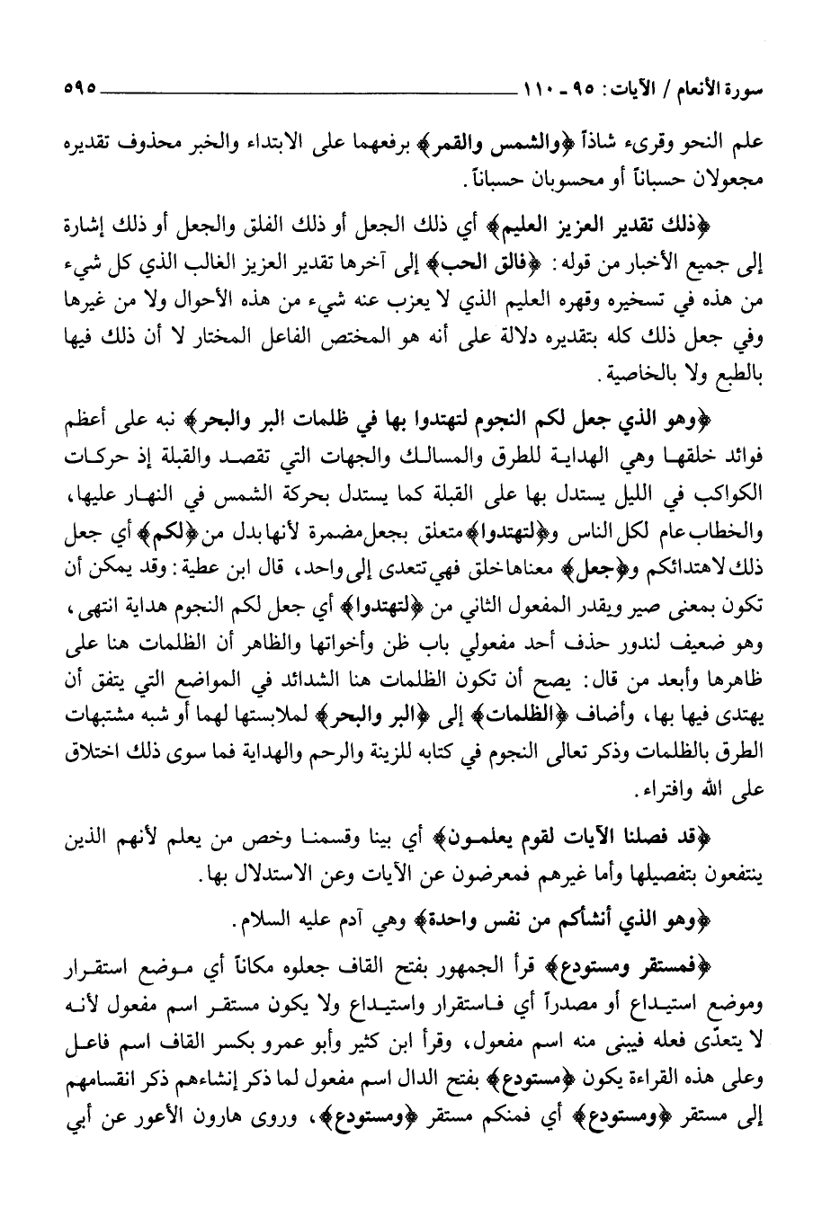 ذلِكَ تَقْدِيرُ الْعَزِيزِ الْعَلِيمِ أَيْ ذَلِكَ الْجَعْلُ أَوْ ذَلِكَ الْفَلْقُ وَالْجَعْلُ أَوْ ذَلِكَ إِشَارَةٌ إِلَى جَمِيعِ الْأَخْبَارِ مِنْ قَوْلِهِ: فالِقُ الْحَبِّ إِلَى آخِرِهَا تَقْدِيرُ الْعَزِيزِ الْغَالِبِ الَّذِي كُلُّ شَيْءٍ مِنْ هَذِهِ فِي تَسْخِيرِهِ وَقَهْرِهِ الْعَلِيمِ الَّذِي لَا يَعْزُبُ عَنْهُ شَيْءٌ مِنْ هَذِهِ الْأَحْوَالِ وَلَا مِنْ غَيْرِهَا وَفِي جَعْلِ ذَلِكَ كُلِّهِ بِتَقْدِيرِهِ دَلَالَةٌ عَلَى أَنَّهُ هُوَ الْمُخْتَصُّ الْفَاعِلُ الْمُخْتَارُ لَا أَنَّ ذَلِكَ فِيهَا بِالطَّبْعِ وَلَا بِالْخَاصِّيَّةِ.