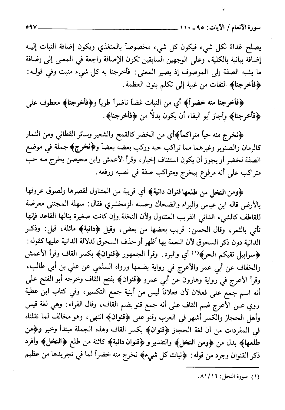 ، وَقَرَأَ الْأَعْرَجُ فِي رِوَايَةٍ وَهَارُونَ عَنْ أَبِي عَمْرٍو قِنْوانٌ بِفَتْحِ الْقَافِ وَخَرَّجَهُ أَبُو الْفَتْحِ عَلَى أَنَّهُ اسْمُ جَمْعٍ عَلَى فَعْلَانٍ لِأَنَّ فَعْلَانًا لَيْسَ مِنْ أَبْنِيَةِ جَمْعِ التَّكْسِيرِ، وَفِي كِتَابِ ابْنِ عَطِيَّةَ روي عَنِ الْأَعْرَجِ ضَمُّ الْقَافِ عَلَى أَنَّهُ جَمْعُ قِنْوٍ بِضَمِّ الْقَافِ، وَقَالَ الْفَرَّاءُ: وَهِيَ لُغَةٌ قَيْسٍ وَأَهْلِ الْحِجَازِ وَالْكَسْرُ أَشْهَرُ فِي الْعَرَبِ وَقِنْوٌ عَلَى قِنْوانٌ انْتَهَى، وَهُوَ مُخَالِفٌ لِمَا نَقَلْنَاهُ فِي الْمُفْرَدَاتِ مِنْ أَنَّ لُغَةَ الْحِجَازِ قِنْوانٌ بِكَسْرِ الْقَافِ وَهَذِهِ الْجُمْلَةُ مُبْتَدَأٌ وَخَبَرٌ ومِنْ طَلْعِها بَدَلٌ مِنْ وَمِنَ النَّخْلِ والتقدير وقِنْوانٌ دانِيَةٌ كَائِنَةٌ مِنْ طَلْعِ النَّخْلِ وَأُفْرِدَ ذِكْرُ الْقِنْوَانِ وَجُرِّدَ مِنْ قَوْلِهِ: نَباتَ كُلِّ شَيْءٍ نُخْرِجُ مِنْهُ خَضِرًا لِمَا فِي تَجْرِيدِهَا من عظيم