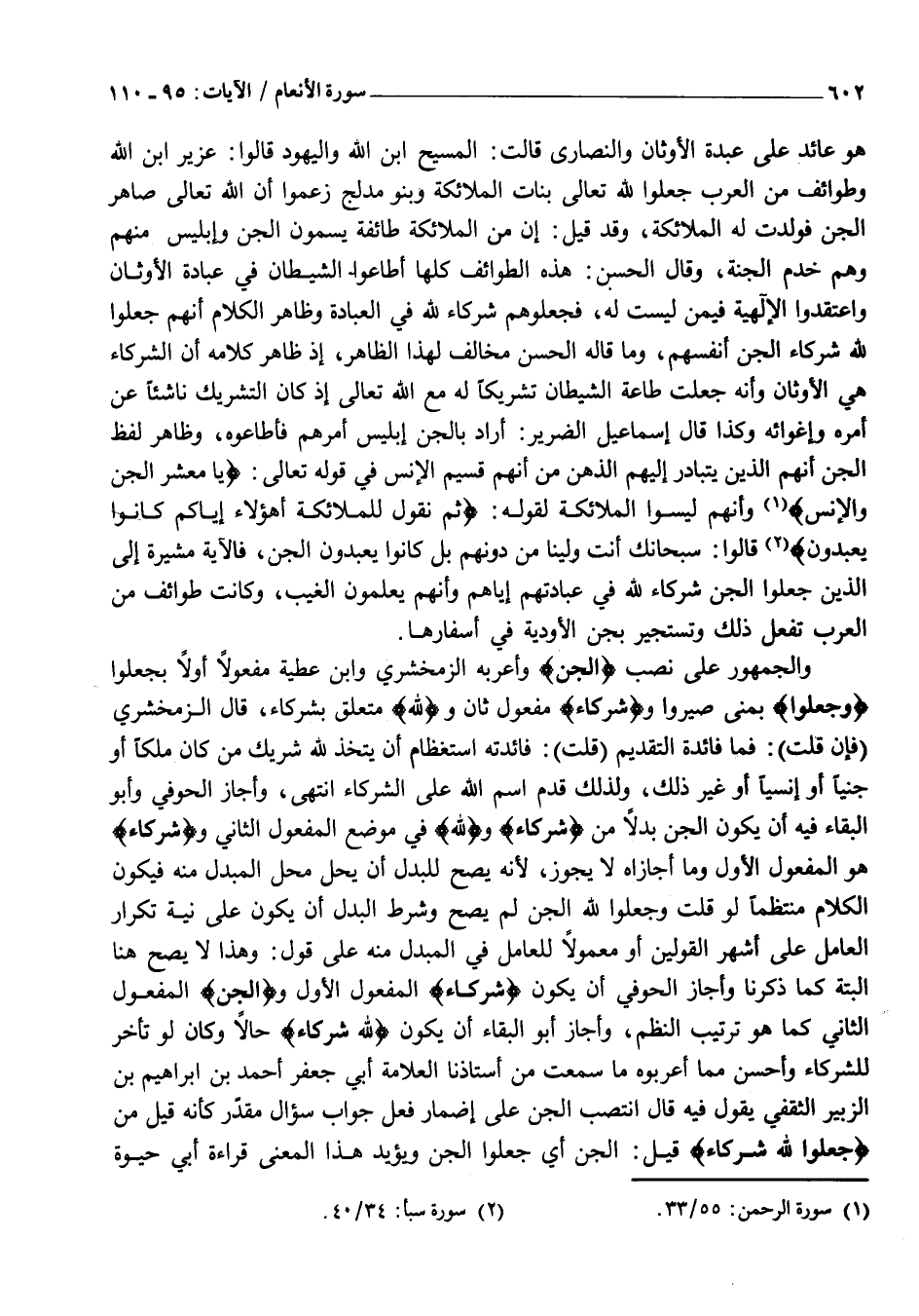 هُوَ عَائِدٌ عَلَى عَبَدَةِ الْأَوْثَانِ وَالنَّصَارَى قَالَتْ: الْمَسِيحُ ابْنُ اللَّهِ وَالْيَهُودُ قَالُوا: عُزَيْرٌ ابْنُ اللَّهِ وَطَوَائِفُ مِنَ الْعَرَبِ جَعَلُوا لِلَّهِ تَعَالَى بَنَاتٍ الْمَلَائِكَةَ وَبَنُو مُدْلِجٍ زَعَمُوا أَنَّ اللَّهَ تَعَالَى صَاهَرَ الْجِنَّ فَوَلَدَتْ لَهُ الْمَلَائِكَةَ، وَقَدْ قِيلَ: إِنَّ مِنَ الْمَلَائِكَةِ طَائِفَةً يُسَمَّوْنَ الْجِنَّ وَإِبْلِيسُ مِنْهُمْ وَهُمْ خَدَمُ الْجَنَّةِ، وَقَالَ الْحَسَنُ: هَذِهِ الطَّوَائِفُ كُلُّهَا أَطَاعُوا الشَّيْطَانَ فِي عِبَادَةِ الْأَوْثَانِ وَاعْتَقَدُوا الْإِلَهِيَّةَ فِيمَنْ لَيْسَتْ لَهُ، فَجَعَلُوهُمْ شُرَكَاءَ لِلَّهِ فِي الْعِبَادَةِ وَظَاهِرُ الْكَلَامِ أَنَّهُمْ جَعَلُوا لِلَّهِ شُرَكَاءَ الْجِنَّ أَنْفُسَهُمْ، وَمَا قَالَهُ الْحَسَنُ مُخَالِفٌ لِهَذَا الظَّاهِرِ، إِذْ ظَاهِرُ كَلَامِهِ أَنَّ الشُّرَكَاءَ هِيَ الْأَوْثَانُ وَأَنَّهُ جَعَلَتْ طَاعَةَ الشَّيْطَانِ تَشْرِيكًا لَهُ مَعَ اللَّهِ تَعَالَى إِذْ كَانَ التَّشْرِيكُ نَاشِئًا عَنْ أَمْرِهِ وَإِغْوَائِهِ وَكَذَا قَالَ إِسْمَاعِيلُ الضَّرِيرُ: أَرَادَ بِالْجِنِّ إِبْلِيسَ أَمَرَهُمْ فَأَطَاعُوهُ، وَظَاهِرُ لَفْظِ الْجِنِّ أَنَّهُمُ الَّذِينَ يَتَبَادَرُ إِلَيْهِمُ الذِّهْنُ مِنْ أَنَّهُمْ قَسِيمُ الْإِنْسِ فِي قَوْلِهِ تَعَالَى: امَعْشَرَ الْجِنِّ وَالْإِنْسِ