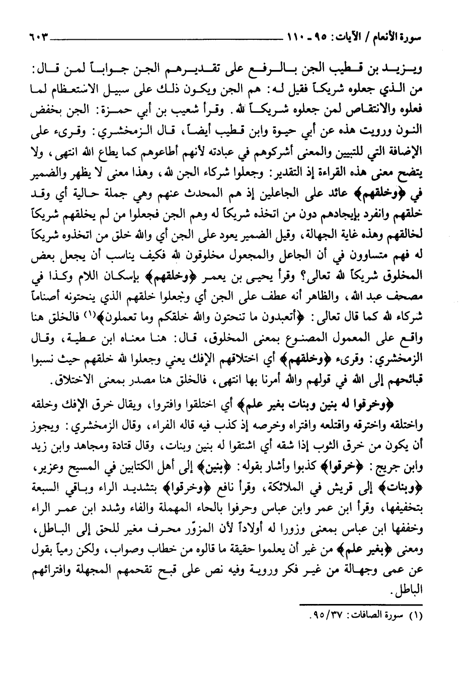 وَخَرَقُوا لَهُ بَنِينَ وَبَناتٍ بِغَيْرِ عِلْمٍ أَيِ اخْتَلَقُوا وَافْتَرَوْا، وَيُقَالُ خَرَقَ الْإِفْكَ وَخَلَقَهُ وَاخْتَلَقَهُ وَاخْتَرَقَهُ واقتلعه وافتراه وخرصه إذ كَذَبَ فِيهِ قَالَهُ الْفَرَّاءُ، وَقَالَ الزَّمَخْشَرِيُّ: وَيَجُوزُ أَنْ يَكُونَ مِنْ خَرَقَ الثَّوْبَ إِذَا شَقَّهُ أَيِ اشْتَقُّوا لَهُ بَنِينَ وَبَنَاتٍ، وَقَالَ قَتَادَةُ وَمُجَاهِدٌ وَابْنُ زَيْدٍ وَابْنُ جُرَيْجٍ: خَرَقُوا كَذَبُوا وَأَشَارَ بِقَوْلِهِ: بَنِينَ إِلَى أَهْلِ الْكِتَابَيْنِ فِي الْمَسِيحِ وَعُزَيْرٍ، وَبَناتٍ إِلَى قُرَيْشٍ فِي الْمَلَائِكَةِ، وَقَرَأَ نَافِعٌ وَخَرَقُوا بِتَشْدِيدِ الرَّاءِ وَبَاقِي السَّبْعَةِ بِتَخْفِيفِهَا، وَقَرَأَ ابْنُ عُمَرَ وَابْنُ عَبَّاسٍ وَحَرَفُوا بِالْحَاءِ الْمُهْمَلَةِ وَالْفَاءِ وَشَدَّدَ ابْنُ عُمَرَ الرَّاءَ وَخَفَّفَهَا ابن عباس بمعنى وزورا لَهُ أَوْلَادًا لِأَنَّ الْمُزَوِّرَ مُحَرِّفٌ مُغَيِّرٌ لِلْحَقِّ إِلَى الْبَاطِلِ، وَمَعْنَى بِغَيْرِ عِلْمٍ مِنْ غَيْرِ أَنْ يَعْلَمُوا حَقِيقَةَ مَا قَالُوهُ مَنْ خطاب وَصَوَابٍ، وَلَكِنْ رَمْيًا بِقَوْلٍ عَنْ عَمَى وَجَهَالَةٍ مِنْ غَيْرِ فِكْرٍ وَرَوِيَّةٍ وَفِيهِ نَصٌّ عَلَى قُبْحِ تُقَحُّمِهِمُ المجهلة وافترائهم الباطل.