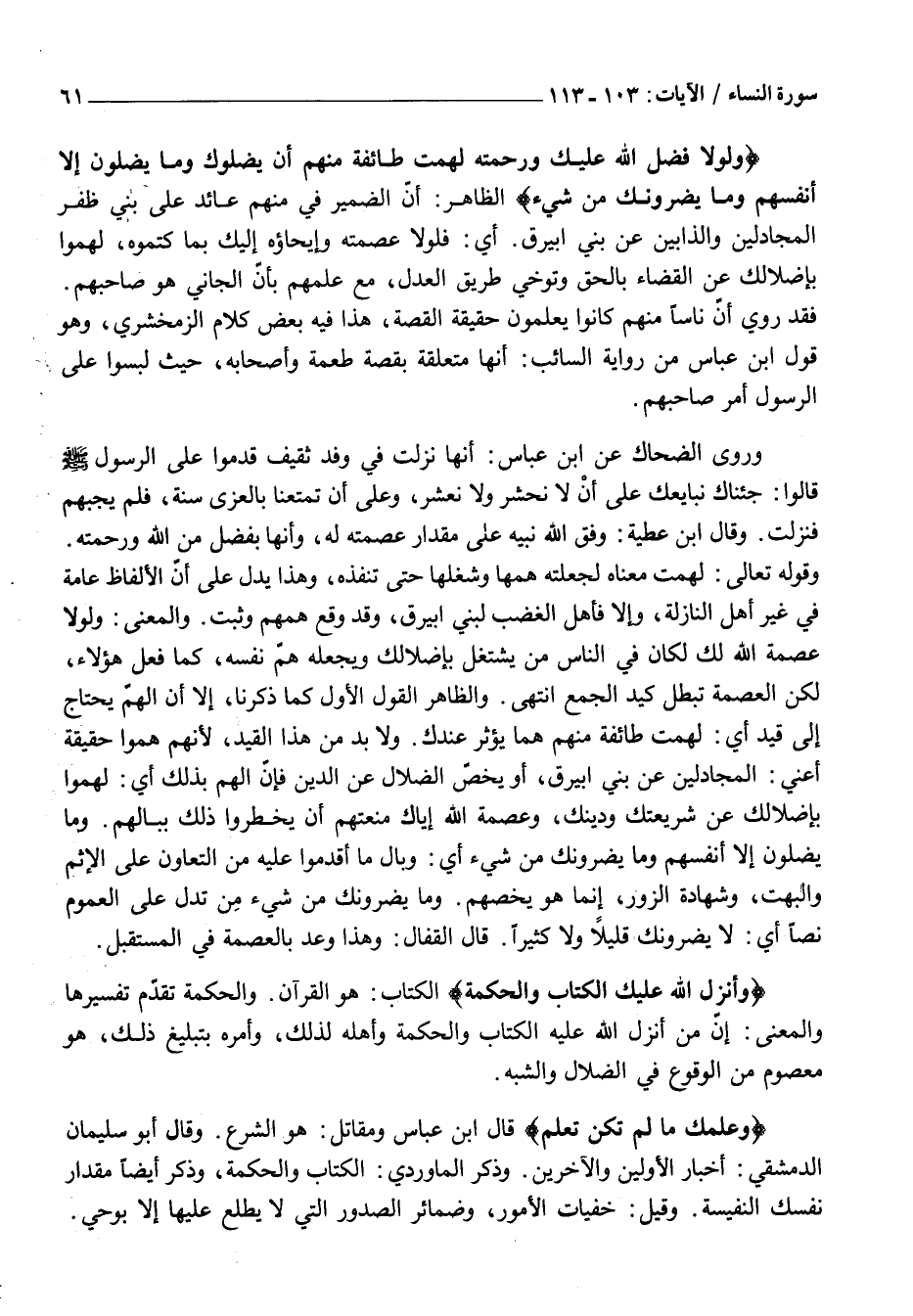 وَقَوْلُهُ تَعَالَى: لَهَمَّتْ مَعْنَاهُ لَجَعَلَتْهُ هَمَّهَا وَشُغْلَهَا حَتَّى تُنَفِّذَهُ، وَهَذَا يَدُلُّ عَلَى أَنَّ الْأَلْفَاظَ عَامَّةٌ فِي غَيْرِ أَهْلِ النَّازِلَةِ، وَإِلَّا فَأَهْلُ الْغَضَبِ لِبَنِي أُبَيْرِقٍ، وَقَدْ وَقَعَ هَمُّهُمْ وَثَبَتَ. وَالْمَعْنَى: وَلَوْلَا عِصْمَةُ اللَّهِ لَكَ لَكَانَ فِي النَّاسِ مَنْ يَشْتَغِلُ بِإِضْلَالِكَ وَيَجْعَلُهُ هَمَّ نَفْسِهِ، كَمَا فَعَلَ هَؤُلَاءِ، لَكِنَّ الْعِصْمَةَ تُبْطِلُ كَيْدَ الْجَمْعِ انْتَهَى. وَالظَّاهِرُ الْقَوْلُ الْأَوَّلُ كَمَا ذَكَرْنَا، إِلَّا أَنَّ الْهَمَّ يَحْتَاجُ إِلَى قَيْدٍ أَيْ: لَهَمَّتْ طَائِفَةٌ مِنْهُمْ هَمًّا يُؤَثِّرُ عِنْدَكَ. وَلَا بُدَّ مِنْ هَذَا الْقَيْدِ، لِأَنَّهُمْ هَمُّوا حَقِيقَةً أَعْنِي: الْمُجَادِلِينَ عَنْ بَنِي أُبَيْرِقٍ، أَوْ يَخُصُّ الضَّلَالَ عَنِ الدِّينِ فَإِنَّ الْهَمَّ بِذَلِكَ أَيْ: لَهَمُّوا بِإِضْلَالِكَ عَنْ شَرِيعَتِكَ وَدِينِكَ، وَعِصْمَةُ اللَّهِ إِيَّاكَ مَنَعَتْهُمْ أَنْ يُخْطِرُوا ذَلِكَ بِبَالِهِمْ. وَمَا يُضِلُّونَ إِلَّا أَنْفُسَهُمْ وَمَا يَضُرُّونَكَ مِنْ شَيْءٍ أَيْ: وَبَالُ ما أقدموا عليه من التَّعَاوُنِ عَلَى الْإِثْمِ وَالْبُهْتِ، وَشَهَادَةِ الزُّورِ، إِنَّمَا هُوَ يَخُصُّهُمْ. وَمَا يَضُرُّونَكَ مِنْ شَيْءٍ مِنْ تَدَلُّ عَلَى الْعُمُومِ نَصًّا أَيْ: لَا يَضُرُّونَكَ قَلِيلًا وَلَا كَثِيرًا. قَالَ الْقَفَّالُ: وَهَذَا وَعْدٌ بِالْعِصْمَةِ فِي الْمُسْتَقْبَلِ.