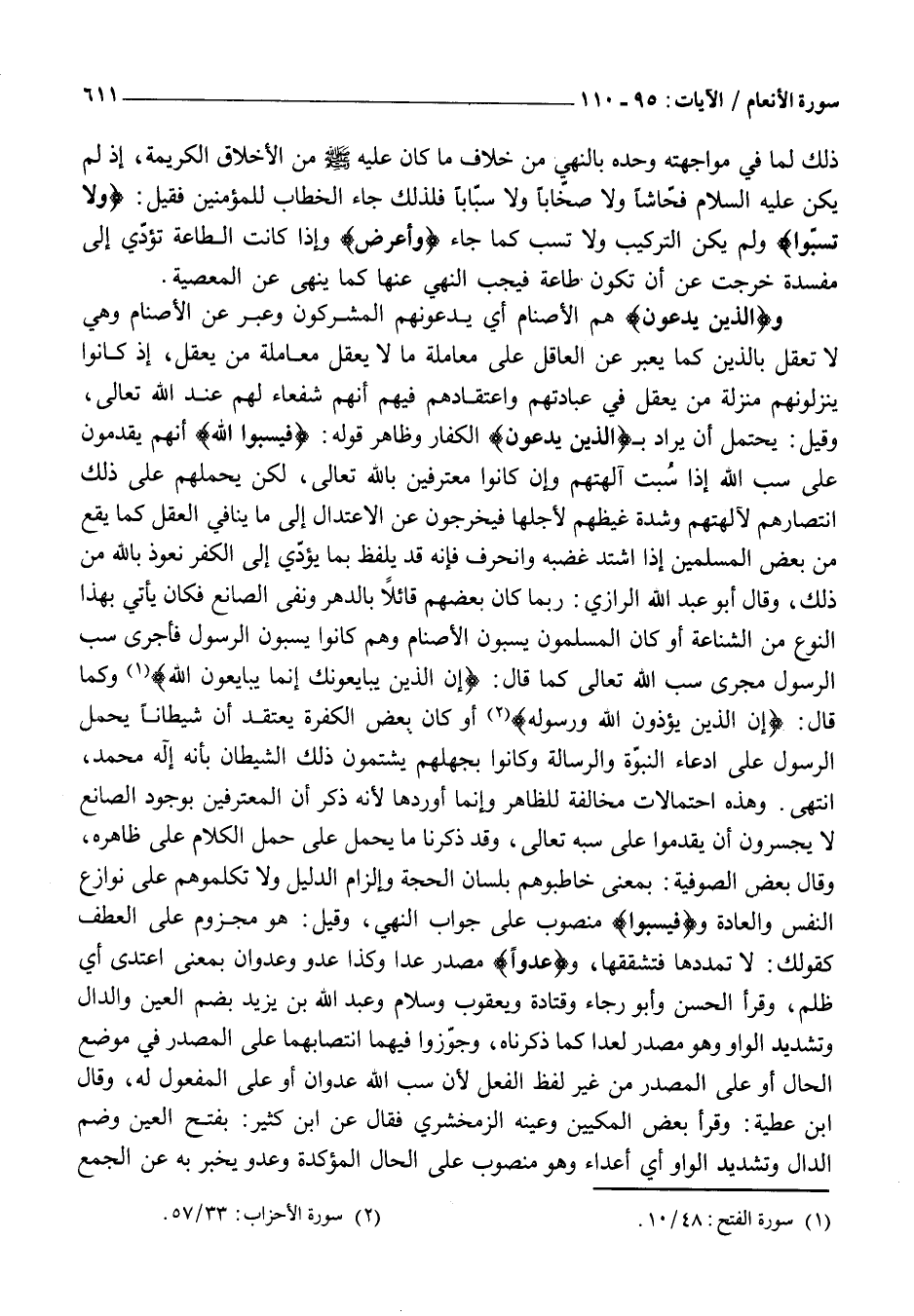 والَّذِينَ يَدْعُونَ هُمُ الْأَصْنَامُ أَيْ يَدْعُونَهُمُ الْمُشْرِكُونَ وَعَبَّرَ عَنِ الْأَصْنَامِ وَهِيَ لَا تَعْقِلُ بِالَّذِينِ كَمَا يُعَبَّرُ عَنِ الْعَاقِلِ عَلَى مُعَامَلَةِ مَا لَا يَعْقِلُ مُعَامَلَةَ مَنْ يَعْقِلُ، إِذْ كَانُوا يُنْزِلُونَهُمْ مَنْزِلَةَ مَنْ يَعْقِلُ فِي عِبَادَتِهِمْ وَاعْتِقَادِهِمْ فِيهِمْ أَنَّهُمْ شُفَعَاءُ لَهُمْ عِنْدَ اللَّهِ تَعَالَى، وَقِيلَ: يُحْتَمَلُ أَنْ يُرَادَ بِ الَّذِينَ يَدْعُونَ الْكُفَّارُ وَظَاهِرُ قَوْلِهِ: فَيَسُبُّوا اللَّهَ أَنَّهُمْ يُقْدِمُونَ عَلَى سب الله إذا سبت آلِهَتَهُمْ وَإِنْ كَانُوا مُعْتَرِفِينَ بِاللَّهِ تَعَالَى، لَكِنْ يَحْمِلُهُمْ عَلَى ذَلِكَ انْتِصَارُهُمْ لِآلِهَتِهِمْ وَشَدَّةُ غَيْظِهِمْ لِأَجْلِهَا فَيَخْرُجُونَ عَنْ الِاعْتِدَالِ إِلَى مَا يُنَافِي الْعَقْلَ كَمَا يَقَعُ مِنْ بَعْضِ الْمُسْلِمِينَ إِذَا اشْتَدَّ غَضَبُهُ وَانْحَرَفَ فَإِنَّهُ قَدْ يَلْفِظُ بِمَا يُؤَدِّي إِلَى الْكُفْرِ نَعُوذُ بِاللَّهِ مِنْ ذَلِكَ، وَقَالَ أَبُو عَبْدِ اللَّهِ الرَّازِيُّ: رُبَّمَا كَانَ بَعْضُهُمْ قَائِلًا بِالدَّهْرِ وَنَفْيِ الصَّانِعِ فَكَانَ يَأْتِي بِهَذَا النَّوْعِ مِنَ الشَّنَاعَةِ أَوْ كَانَ الْمُسْلِمُونَ يَسُبُّونَ الْأَصْنَامَ وَهُمْ كَانُوا يَسُبُّونَ الرَّسُولَ فَأُجْرِيَ سَبُّ الرَّسُولِ مُجْرَى سَبِّ اللَّهِ تَعَالَى كَمَا قَالَ: إِنَّ الَّذِينَ يُبايِعُونَكَ إِنَّما يُبايِعُونَ اللَّهَ «1» وَكَمَا قَالَ: إِنَّ الَّذِينَ يُؤْذُونَ اللَّهَ وَرَسُولَهُ «2» أَوْ كَانَ بَعْضُ الْكَفَرَةِ يَعْتَقِدُ أَنْ شَيْطَانًا يَحْمِلُ الرَّسُولَ عَلَى ادِّعَاءِ النُّبُوَّةِ وَالرِّسَالَةِ وَكَانُوا بِجَهْلِهِمْ يَشْتُمُونَ ذَلِكَ الشَّيْطَانَ بِأَنَّهُ إِلَهُ مُحَمَّدٍ، انْتَهَى. وَهَذِهِ احْتِمَالَاتٌ مُخَالِفَةٌ لِلظَّاهِرِ وَإِنَّمَا أَوْرَدَهَا لِأَنَّهُ ذَكَرَ أَنَّ الْمُعْتَرِفِينَ بِوُجُودِ الصَّانِعِ لَا يَجْسُرُونَ أَنْ يُقْدِمُوا عَلَى سَبِّهِ تَعَالَى، وَقَدْ ذَكَرْنَا مَا يُحْمَلُ عَلَى حَمَلَ الْكَلَامَ عَلَى ظَاهِرِهِ، وَقَالَ بَعْضُ الصُّوفِيَّةِ: بِمَعْنَى خَاطِبُوهُمْ بِلِسَانِ الْحُجَّةِ وَإِلْزَامِ الدَّلِيلِ وَلَا تُكَلِّمُوهُمْ عَلَى نَوَازِعِ النَّفْسِ وَالْعَادَةِ وفَيَسُبُّوا مَنْصُوبٌ عَلَى جَوَابِ النَّهْيِ، وَقِيلَ: هُوَ مَجْزُومٌ عَلَى الْعَطْفِ كَقَوْلِكَ: لَا تَمْدُدْهَا فتشققها، وعَدْواً مَصْدَرُ عَدَا وَكَذَا عَدَوَ وَعُدْوَانٍ بِمَعْنَى اعْتَدَى أَيْ ظَلَمَ، وَقَرَأَ الْحَسَنُ وَأَبُو رَجَاءٍ وَقَتَادَةُ وَيَعْقُوبُ وَسَلَّامٌ وَعَبْدُ اللَّهِ بْنُ يَزِيدَ بِضَمِّ الْعَيْنِ وَالدَّالِ وَتَشْدِيدِ الْوَاوِ وَهُوَ مَصْدَرٌ لِعَدَا كَمَا ذَكَرْنَاهُ، وَجَوَّزُوا فِيهِمَا انْتِصَابَهُمَا عَلَى الْمَصْدَرِ فِي مَوْضِعِ الْحَالِ أَوْ عَلَى الْمَصْدَرِ مِنْ غَيْرِ لَفْظِ الْفِعْلِ لِأَنَّ سَبَّ اللَّهِ عُدْوَانٌ أَوْ عَلَى الْمَفْعُولِ لَهُ، وَقَالَ ابْنُ عَطِيَّةَ: وَقَرَأَ بَعْضُ الْمَكِّيِّينَ وَعَيَّنَهُ الزَّمَخْشَرِيُّ فَقَالَ عَنِ ابْنِ كَثِيرٍ: بِفَتْحِ الْعَيْنِ وَضَمِّ الدَّالِ وَتَشْدِيدِ الْوَاوِ أَيْ أَعْدَاءً وَهُوَ مَنْصُوبٌ عَلَى الْحَالِ الْمُؤَكِّدَةِ وَعَدُوٌّ يُخْبَرُ به عن الجمع