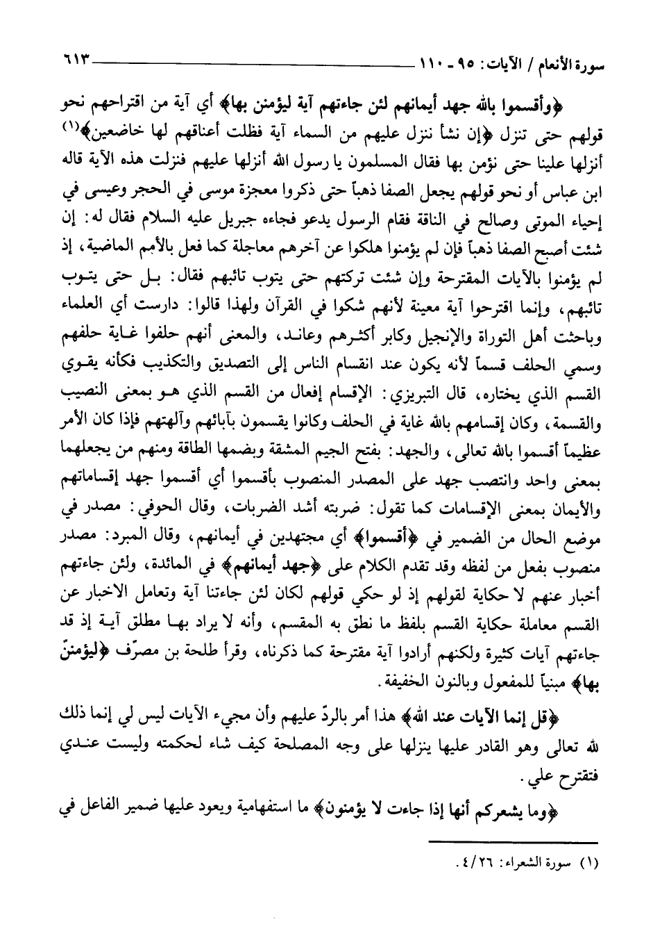 ، وَإِنَّمَا اقْتَرَحُوا آيَةً مُعَيَّنَةً لِأَنَّهُمْ شَكُّوا فِي الْقُرْآنِ وَلِهَذَا قَالُوا: دَارَسْتَ أَيِ الْعُلَمَاءَ وَبَاحَثْتَ أَهْلَ التَّوْرَاةِ وَالْإِنْجِيلِ وَكَابَرَ أَكْثَرُهُمْ وَعَانَدَ، وَالْمَعْنَى أَنَّهُمْ حَلَفُوا غَايَةَ حَلِفِهِمْ وَسُمِّيَ الْحَلِفُ قَسَمًا لِأَنَّهُ يَكُونُ عِنْدَ انْقِسَامِ النَّاسِ إِلَى التَّصْدِيقِ وَالتَّكْذِيبِ فَكَأَنَّهُ يُقَوِّي الْقِسْمَ الَّذِي يَخْتَارُهُ، قَالَ التِّبْرِيزِيُّ: الْإِقْسَامُ إِفْعَالٌ مِنَ الْقَسَمِ الَّذِي هُوَ بِمَعْنَى النَّصِيبِ وَالْقِسْمَةِ، وَكَانَ إِقْسَامُهُمْ بِاللَّهِ غَايَةً فِي الْحَلِفِ وَكَانُوا يُقْسِمُونَ بِآبَائِهِمْ وَآلِهَتِهِمْ فَإِذَا كَانَ الْأَمْرُ عَظِيمًا أَقْسَمُوا بِاللَّهِ تَعَالَى، وَالْجَهْدُ: بِفَتْحِ الْجِيمِ الْمَشَقَّةُ وَبِضَمِّهَا الطَّاقَةُ وَمِنْهُمْ مَنْ يَجْعَلُهُمَا بِمَعْنًى وَاحِدٍ وَانْتَصَبَ جَهْدَ على المصدر المنصوب بأقسموا أَيْ أَقْسَمُوا جَهْدَ إِقْسَامَاتِهِمْ وَالْأَيْمَانُ بِمَعْنَى الْإِقْسَامَاتِ كَمَا تَقُولُ: ضَرَبْتُهُ أَشَدَّ الضَّرَبَاتِ، وَقَالَ الْحَوْفِيُّ: مَصْدَرٌ فِي مَوْضِعِ الْحَالِ مِنَ الضَّمِيرِ فِي أَقْسَمُوا أَيْ مُجْتَهِدِينَ فِي أَيْمَانِهِمْ، وَقَالَ الْمُبَرِّدَ: مَصْدَرٌ مَنْصُوبٌ بِفِعْلٍ مِنْ لَفْظِهِ وَقَدْ تَقَدَّمَ الْكَلَامُ عَلَى جَهْدَ أَيْمانِهِمْ فِي المائدة، ولئن جَاءَتْهُمْ إِخْبَارٌ عَنْهُمْ لَا حِكَايَةٌ لِقَوْلِهِمْ إِذْ لَوْ حُكِيَ قَوْلُهُمْ لَكَانَ لَئِنْ جاءتنا آية وتعامل الْإِخْبَارَ عَنِ الْقَسَمِ مُعَامَلَةَ حِكَايَةِ الْقَسَمِ بِلَفْظِ مَا نَطَقَ بِهِ الْمُقْسِمُ، وَأَنَّهُ لَا يُرَادُ بِهَا مُطْلَقُ آيَةٍ إِذْ قَدْ جَاءَتْهُمْ آيَاتٌ كَثِيرَةٌ وَلَكِنَّهُمْ أَرَادُوا آيَةً مُقْتَرَحَةً كَمَا ذَكَرْنَاهُ، وَقَرَأَ طَلْحَةُ بْنُ مُصَرِّفٍ لَيُؤْمِنُنَّ بِها مَبْنِيًّا لِلْمَفْعُولِ وَبِالنُّونِ الْخَفِيفَةِ.