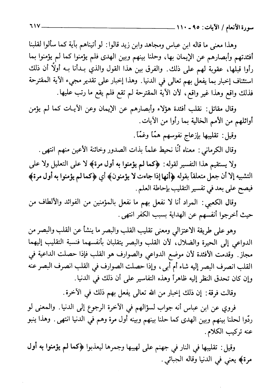 وَهُوَ عَلَى طَرِيقَةِ الِاعْتِزَالِيِّ وَمَعْنَى تَقْلِيبِ الْقَلْبِ وَالْبَصَرِ مَا يَنْشَأُ عَنِ الْقَلْبِ وَالْبَصَرِ مِنَ الدَّوَاعِي إِلَى الْحَيْرَةِ وَالضَّلَالِ، لِأَنَّ الْقَلْبَ وَالْبَصَرَ يَتَقَلَّبَانِ بِأَنْفُسِهِمَا فَنِسْبَةُ التَّقْلِيبِ إِلَيْهِمَا مَجَازٌ. وَقُدِّمَتِ الْأَفْئِدَةُ لِأَنَّ مَوْضِعَ الدَّوَاعِي وَالصَّوَارِفِ هُوَ الْقَلْبُ فَإِذَا حَصَلَتِ الدَّاعِيَةُ فِي الْقَلْبِ انْصَرَفَ الْبَصَرُ إِلَيْهِ شَاءَ أَمْ أَبَى، وَإِذَا حَصَلَتِ الصَّوَارِفُ فِي الْقَلْبِ انْصَرَفَ الْبَصَرُ عَنْهُ وَإِنْ كَانَ تَحَدُّقُ النَّظَرِ إِلَيْهِ ظَاهِرًا وَهَذِهِ التَّفَاسِيرُ عَلَى أَنَّ ذَلِكَ فِي الدُّنْيَا.