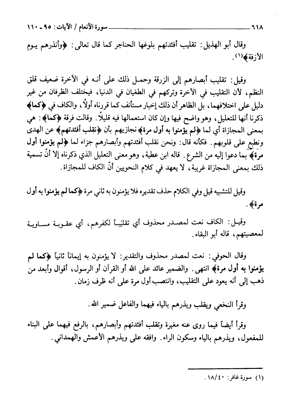 وَقِيلَ: تَقْلِيبُ أَبْصَارِهِمْ إِلَى الزُّرْقَةِ وَحَمْلُ ذَلِكَ عَلَى أَنَّهُ فِي الْآخِرَةِ ضَعِيفٌ قَلِقُ النَّظْمِ، لِأَنَّ التَّقْلِيبَ فِي الْآخِرَةِ وَتَرْكَهُمْ فِي الطُّغْيَانِ فِي الدُّنْيَا، فَيَخْتَلِفُ الظَّرْفَانِ مِنْ غَيْرِ دَلِيلٍ عَلَى اخْتِلَافِهِمَا، بَلِ الظَّاهِرُ أَنَّ ذَلِكَ إِخْبَارٌ مُسْتَأْنَفٌ كَمَا قَرَّرْنَاهُ أَوَّلًا، وَالْكَافُ فِي كَما ذَكَرْنَا أَنَّهَا لِلتَّعْلِيلِ، وَهُوَ وَاضِحٌ فِيهَا وَإِنْ كَانَ اسْتِعْمَالُهَا فِيهِ قَلِيلًا. وَقَالَتْ فِرْقَةٌ كَما: هِيَ بِمَعْنَى الْمُجَازَاةِ أَيْ لَمَّا لَمْ يُؤْمِنُوا بِهِ أَوَّلَ مَرَّةٍ نُجَازِيهِمْ بِأَنْ نُقَلِّبُ أَفْئِدَتَهُمْ عَنِ الْهُدَى وَنَطْبَعُ عَلَى قُلُوبِهِمْ. فَكَأَنَّهُ قَالَ: وَنَحْنُ نُقَلِّبُ أَفْئِدَتَهُمْ وَأَبْصَارَهُمْ جَزَاءً لِمَا لَمْ يُؤْمِنُوا بِهِ أَوَّلَ مَرَّةٍ بِمَا دُعُوا إِلَيْهِ مِنَ الشَّرْعِ. قَالَهُ ابْنُ عَطِيَّةَ، وَهُوَ مَعْنَى التَّعْلِيلِ الَّذِي ذَكَرْنَاهُ إِلَّا أَنَّ تَسْمِيَةَ ذَلِكَ بِمَعْنَى الْمُجَازَاةِ غَرِيبَةٌ، لَا يُعْهَدُ فِي كَلَامِ النَّحْوِيِّينَ أَنَّ الْكَافَ للمجازاة.