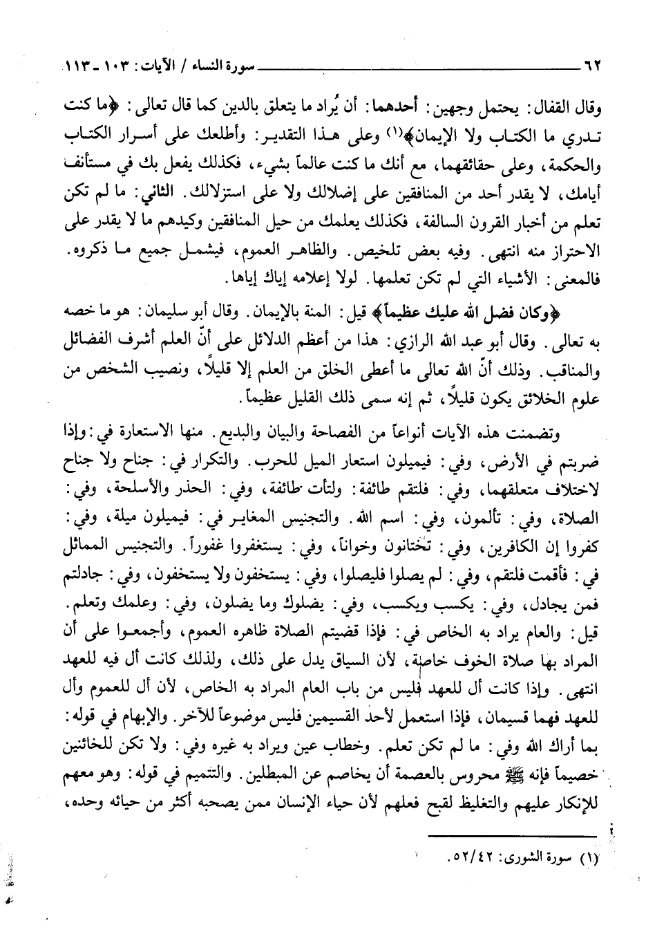 وَقَالَ الْقَفَّالُ: يَحْتَمِلُ وَجْهَيْنِ: أَحَدُهُمَا: أَنْ يُرَادَ مَا يَتَعَلَّقُ بِالدِّينِ كَمَا قَالَ تَعَالَى: مَا كُنْتَ تَدْرِي مَا الْكِتابُ وَلَا الْإِيمانُ «1» وَعَلَى هَذَا التَّقْدِيرِ: وَأَطْلَعَكَ عَلَى أَسْرَارِ الْكِتَابِ وَالْحِكْمَةِ، وَعَلَى حَقَائِقِهِمَا، مَعَ أَنَّكَ مَا كُنْتَ عَالِمًا بِشَيْءٍ، فَكَذَلِكَ يَفْعَلُ بِكَ فِي مُسْتَأْنَفِ أَيَّامِكَ، لَا يَقْدِرُ أَحَدٌ مِنَ الْمُنَافِقِينَ عَلَى إِضْلَالِكَ وَلَا عَلَى اسْتِزْلَالِكَ. الثَّانِي: مَا لَمْ تَكُنْ تَعْلَمُ مِنْ أَخْبَارِ الْقُرُونِ السَّالِفَةِ، فَكَذَلِكَ يُعَلِّمُكَ مِنْ حِيَلِ الْمُنَافِقِينَ وَكَيْدِهِمْ مَا لَا يُقْدَرُ عَلَى الِاحْتِرَازِ مِنْهُ انْتَهَى. وَفِيهِ بَعْضُ تَلْخِيصٍ. وَالظَّاهِرُ الْعُمُومُ، فَيَشْمَلُ جَمِيعَ مَا ذَكَرُوهُ.