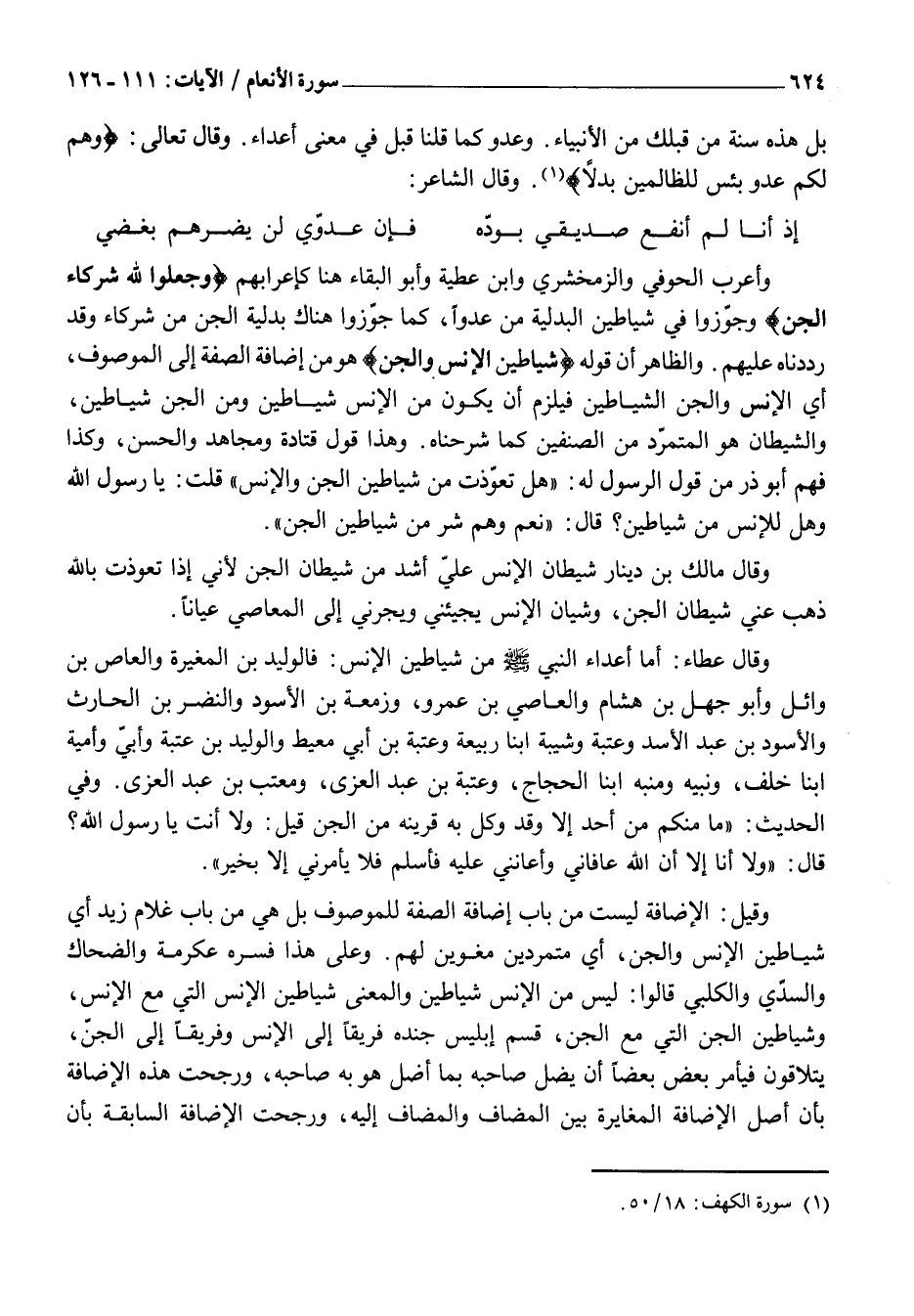 وَأَعْرَبَ الْحَوْفِيُّ وَالزَّمَخْشَرِيُّ وَابْنُ عَطِيَّةَ وَأَبُو الْبَقَاءِ هُنَا كَإِعْرَابِهِمْ وَجَعَلُوا لِلَّهِ شُرَكاءَ الْجِنَّ وَجَوَّزُوا فِي شَيَاطِينَ الْبَدَلِيَّةَ مِنْ عَدُوًّا، كَمَا جَوَّزُوا هُنَاكَ بَدَلَيَّةَ الْجِنَّ مِنْ شُرَكَاءَ وَقَدْ رَدَدْنَاهُ عَلَيْهِمْ. وَالظَّاهِرُ أَنَّ قَوْلَهُ شَياطِينَ الْإِنْسِ وَالْجِنِّ هُوَ مِنْ إِضَافَةِ الصِّفَةِ إِلَى الْمَوْصُوفِ، أَيِ الْإِنْسَ وَالْجِنَّ الشَّيَاطِينَ فَيَلْزَمُ أَنْ يَكُونَ مِنَ الْإِنْسِ شَيَاطِينُ وَمِنَ الْجِنِّ شَيَاطِينُ، وَالشَّيْطَانُ هُوَ الْمُتَمَرِّدُ مِنَ الصِّنْفَيْنِ كَمَا شَرَحْنَاهُ. وَهَذَا قَوْلُ قَتَادَةَ وَمُجَاهِدٍ وَالْحَسَنِ، وكذا