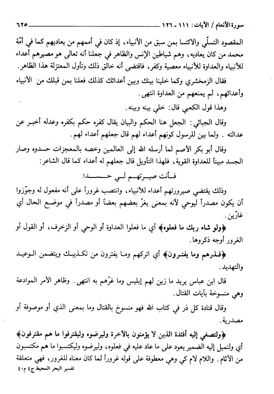 المقصود التسلّي والائتساء بِمَنْ سَبَقَ مِنَ الْأَنْبِيَاءِ، إِذْ كَانَ فِي أُمَمِهِمْ مَنْ يُعَادِيهِمْ كَمَا فِي أُمَّةِ مُحَمَّدٍ مَنْ كَانَ يُعَادِيهِ، وَهُمْ شَيَاطِينُ الْإِنْسِ وَالظَّاهِرُ فِي جَعَلْنَا أَنَّهُ تَعَالَى هُوَ مُصَيِّرُهُمْ أَعْدَاءً لِلْأَنْبِيَاءِ وَالْعَدَاوَةُ لِلْأَنْبِيَاءِ مَعْصِيَةٌ وَكُفْرٌ، فَاقْتَضَى أَنَّهُ خَالِقٌ ذَلِكَ وَتَأَوَّلَ الْمُعْتَزِلَةُ هَذَا الظَّاهِرَ.