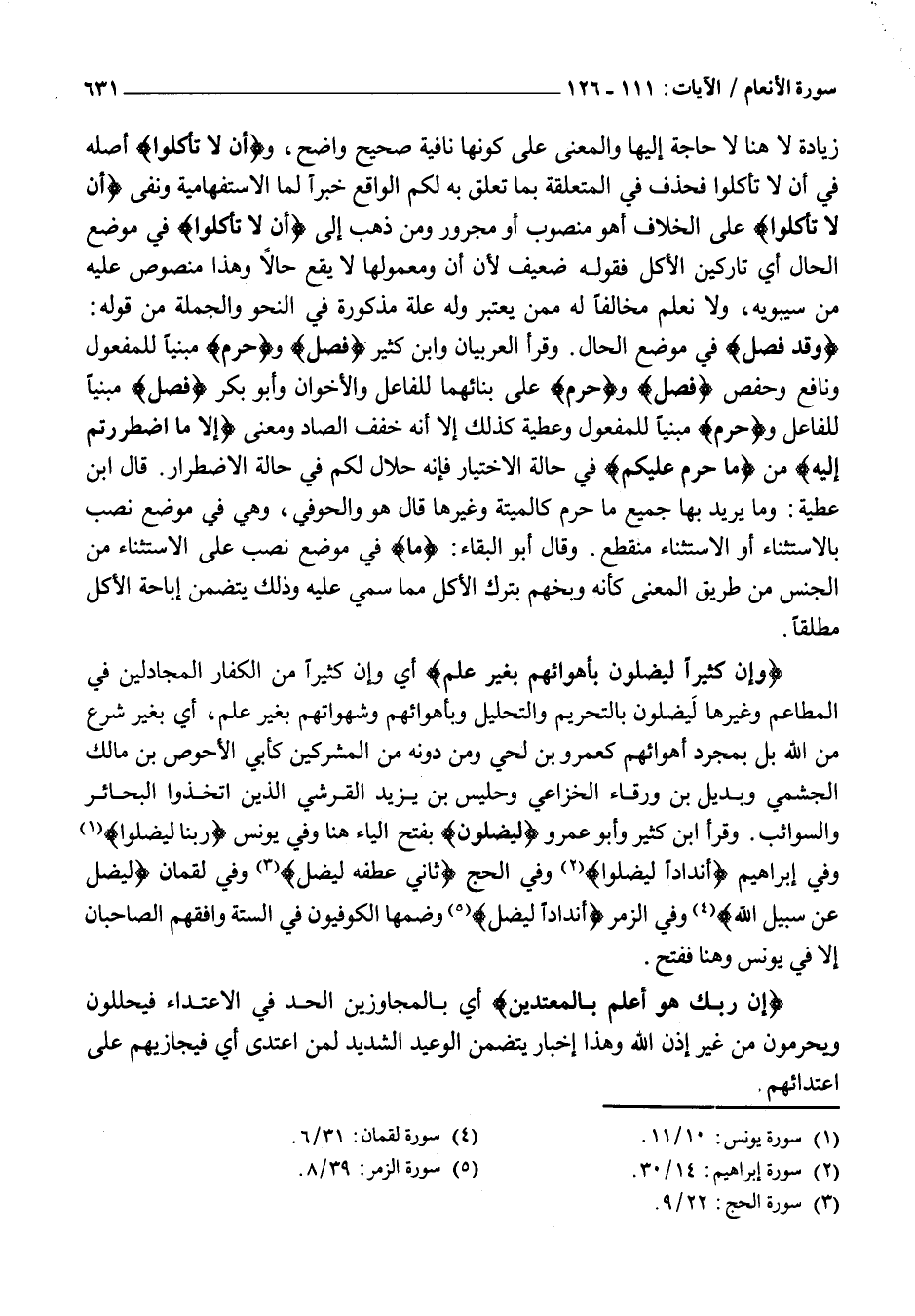 وَإِنَّ كَثِيراً لَيُضِلُّونَ بِأَهْوائِهِمْ بِغَيْرِ عِلْمٍ أَيْ وَإِنَّ كَثِيرًا مِنَ الْكُفَّارِ الْمُجَادِلِينَ فِي الْمَطَاعِمِ وَغَيْرِهَا لَيُضِلُّونَ بِالتَّحْرِيمِ وَالتَّحْلِيلِ وَبِأَهْوَائِهِمْ وَشَهَوَاتِهِمْ بِغَيْرِ عِلْمٍ، أَيْ بِغَيْرِ شَرْعٍ مِنَ اللَّهِ بَلْ بِمُجَرَّدِ أَهْوَائِهِمْ كَعَمْرِو بْنِ لُحَيٍّ وَمَنْ دُونَهُ مِنَ الْمُشْرِكِينَ كَأَبِي الْأَحْوَصِ بْنِ مَالِكٍ الْجَشْمِيِّ وَبُدَيْلِ بْنِ وَرْقَاءَ الْخُزَاعِيِّ وَحُلَيْسِ بْنِ يَزِيدَ الْقُرَشِيِّ الَّذِينَ اتَّخَذُوا الْبَحَائِرَ وَالسَّوَائِبَ. وَقَرَأَ ابْنُ كَثِيرٍ وَأَبُو عَمْرٍو لَيُضِلُّونَ بِفَتْحِ الْيَاءِ هُنَا وَفِي يُونُسَ رَبَّنا لِيُضِلُّوا «1» وَفِي إِبْرَاهِيمَ أَنْداداً لِيُضِلُّوا «2» وَفِي الْحَجِّ ثانِيَ عِطْفِهِ لِيُضِلَّ «3» وَفِي لُقْمَانَ لِيُضِلَّ عَنْ سَبِيلِ اللَّهِ «4» وَفِي الزُّمَرِ أَنْداداً لِيُضِلَّ «5» وَضَمَّهَا الْكُوفِيُّونَ فِي السِّتَّةِ وَافَقَهُمُ الصَّاحِبَانِ إِلَّا فِي يُونُسَ وَهُنَا فَفَتَحَ.