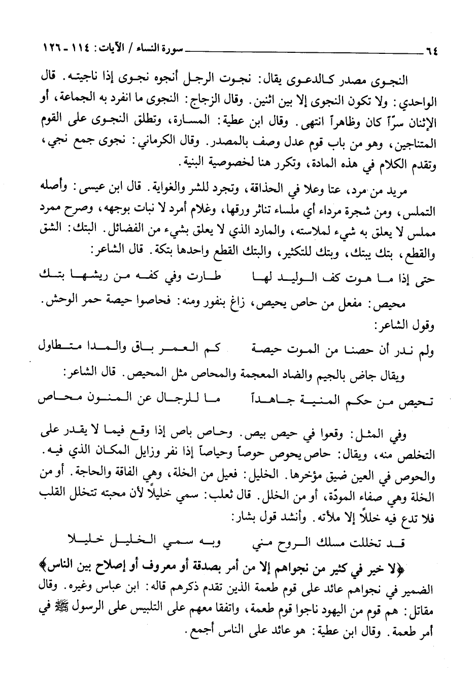 لَا خَيْرَ فِي كَثِيرٍ مِنْ نَجْواهُمْ إِلَّا مَنْ أَمَرَ بِصَدَقَةٍ أَوْ مَعْرُوفٍ أَوْ إِصْلاحٍ بَيْنَ النَّاسِ الضَّمِيرُ فِي نَجْوَاهُمْ عَائِدٌ عَلَى قَوْمِ طُعْمَةَ الَّذِينَ تَقَدَّمَ ذِكْرُهُمْ قَالَهُ: ابْنُ عَبَّاسٍ وَغَيْرُهُ. وَقَالَ مُقَاتِلٌ: هُمْ قَوْمٌ مِنَ الْيَهُودِ نَاجَوْا قَوْمَ طُعْمَةَ، واتفقا مَعَهُمْ عَلَى التَّلْبِيسِ عَلَى الرَّسُولِ صَلَّى اللَّهُ عَلَيْهِ وَسَلَّمَ فِي أَمْرِ طُعْمَةَ. وَقَالَ ابْنُ عَطِيَّةَ: هُوَ عَائِدٌ عَلَى النَّاسِ أَجْمَعَ.