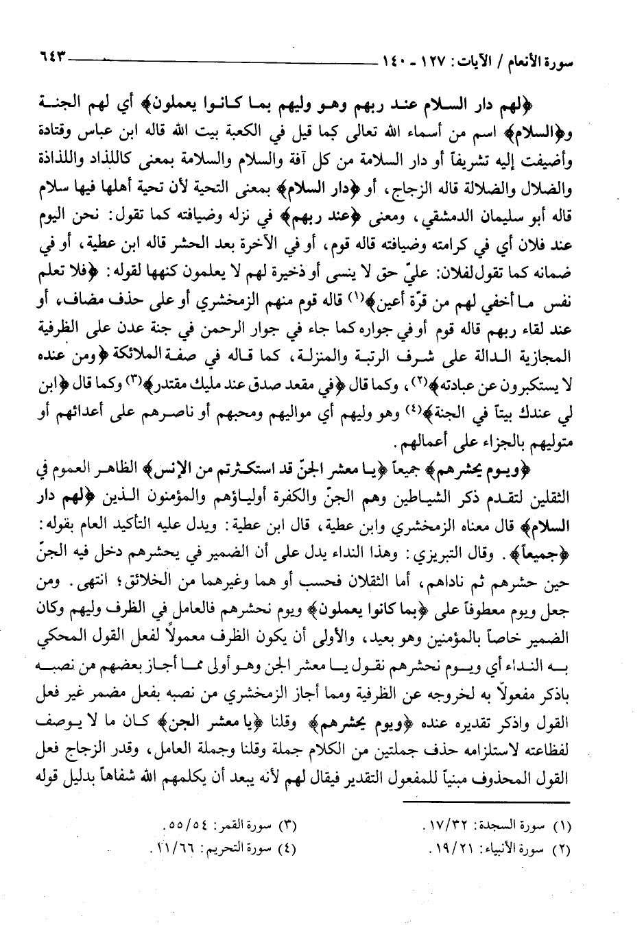 وَيَوْمَ يَحْشُرُهُمْ جَمِيعًا يَا مَعْشَرَ الْجِنِّ قَدِ اسْتَكْثَرْتُمْ مِنَ الْإِنْسِ الظَّاهِرُ الْعُمُومُ فِي الثِّقَلَيْنِ لِتَقَدُّمِ ذِكْرِ الشَّيَاطِينِ وَهُمُ الْجِنُّ وَالْكَفَرَةُ أَوْلِيَاؤُهُمْ وَالْمُؤْمِنُونَ الَّذِينَ لَهُمْ دارُ السَّلامِ قَالَ مَعْنَاهُ الزَّمَخْشَرِيُّ وَابْنُ عَطِيَّةَ، قَالَ ابْنُ عَطِيَّةَ: وَيَدُلُّ عَلَيْهِ التَّأْكِيدُ الْعَامُّ بِقَوْلِهِ:
