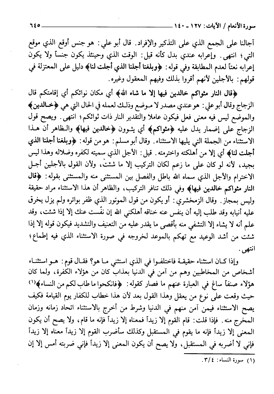 قالَ النَّارُ مَثْواكُمْ خالِدِينَ فِيها إِلَّا مَا شاءَ اللَّهُ أي مكان نوائكم أَيْ إِقَامَتِكُمْ قَالَ الزَّجَّاجُ وَقَالَ أَبُو عَلِيٍّ: هُوَ عِنْدِي مَصْدَرٌ لَا مَوْضِعٌ وَذَلِكَ لِعَمَلِهِ فِي الْحَالِ الَّتِي هِيَ خالِدِينَ وَالْمَوْضِعُ لَيْسَ فِيهِ مَعْنَى فِعْلٍ فَيَكُونُ عَامِلًا وَالتَّقْدِيرُ النَّارُ ذَاتُ ثُوَائِكُمْ انْتَهَى. وَيَصِحُّ قَوْلُ الزَّجَّاجِ عَلَى إِضْمَارٍ يَدُلُّ عَلَيْهِ مَثْواكُمْ أَيْ يَثْوَوْنَ خالِدِينَ فِيها وَالظَّاهِرُ أَنَّ هَذَا الِاسْتِثْنَاءَ مِنَ الْجُمْلَةِ الَّتِي يَلِيهَا الِاسْتِثْنَاءُ. وَقَالَ أَبُو مُسْلِمٍ: هُوَ مِنْ قَوْلِهِ: وَبَلَغْنا أَجَلَنَا الَّذِي أَجَّلْتَ لَنا أَيْ إِلَّا مَنْ أَهْلَكْتَهُ وَاخْتَرَمْتَهُ. قِيلَ: الْأَجَلُ الَّذِي سَمَّيْتَهُ لِكُفْرِهِ وَضَلَالِهِ وَهَذَا لَيْسَ بِجَيِّدٍ، لِأَنَّهُ لَوْ كَانَ عَلَى مَا زَعَمَ لَكَانَ التَّرْكِيبُ إِلَّا مَا شِئْتَ، وَلِأَنَّ الْقَوْلَ بِالْأَجَلَيْنِ أَجْلِ الِاخْتِرَامِ وَالْأَجْلِ الَّذِي سَمَّاهُ اللَّهُ بَاطِلٌ وَالْفَصْلُ بَيْنَ الْمُسْتَثْنَى مِنْهُ وَالْمُسْتَثْنَى بِقَوْلِهِ: قالَ النَّارُ مَثْواكُمْ خالِدِينَ فِيها وَفِي ذَلِكَ تَنَافُرُ التَّرْكِيبِ، وَالظَّاهِرُ أَنَّ هَذَا الِاسْتِثْنَاءَ مُرَادٌ حَقِيقَةً وَلَيْسَ بِمَجَازٍ. وَقَالَ الزَّمَخْشَرِيُّ: أَوْ يَكُونُ مِنْ قَوْلِ الْمُوتُورِ الَّذِي ظَفِرَ بِوَاتِرِهِ وَلَمْ يَزَلْ يَخْرُقُ عَلَيْهِ أَنْيَابَهُ وَقَدْ طَلَبَ إِلَيْهِ أَنْ يُنَفِّسَ عَنْهُ خِنَاقَهُ أَهْلَكَنِيَ اللَّهُ إِنْ نَفَّسْتُ عَنْكَ إِلَّا إِذَا شِئْتَ، وَقَدْ عَلِمَ أَنَّهُ لَا يَشَاءُ إِلَّا التَّشَفِّي مِنْهُ بِأَقْصَى مَا يَقْدِرُ عَلَيْهِ مِنَ التَّعْنِيفِ وَالتَّشْدِيدِ فَيَكُونُ قَوْلُهُ إِلَّا إِذَا شِئْتَ مِنْ أَشَدِّ الْوَعِيدِ مَعَ تَهَكُّمٍ بِالْمَوْعِدِ لِخُرُوجِهِ فِي صُورَةِ الِاسْتِثْنَاءِ الَّذِي فِيهِ إِطْمَاعٌ انْتَهَى.