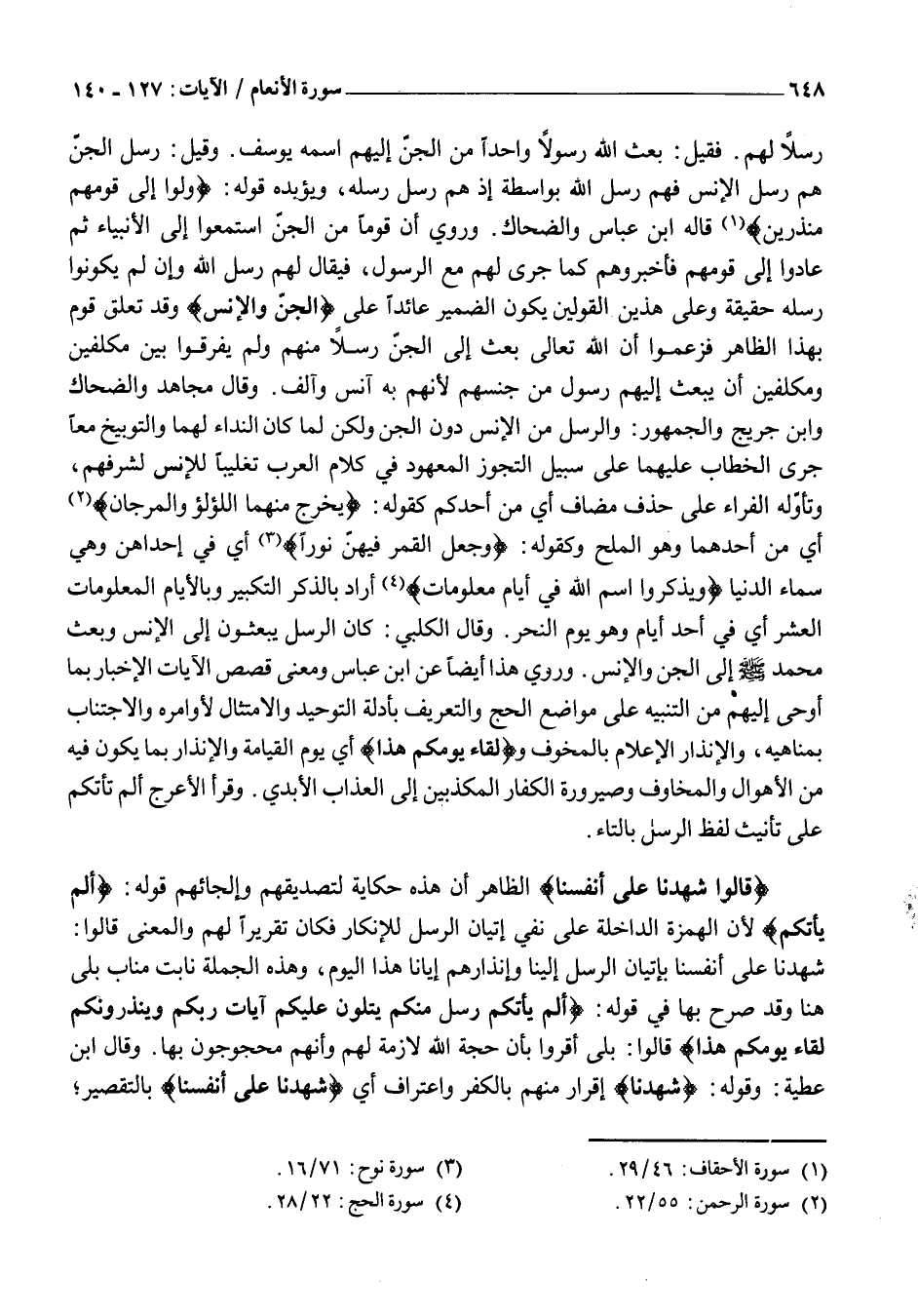 وَقَدْ تَعَلَّقَ قَوْمٌ بِهَذَا الظَّاهِرِ فَزَعَمُوا أَنَّ اللَّهَ تَعَالَى بَعَثَ إِلَى الْجِنِّ رُسُلًا مِنْهُمْ وَلَمْ يُفَرِّقُوا بَيْنَ مُكَلَّفِينَ وَمُكَلَّفِينَ أَنْ يُبْعَثَ إِلَيْهِمْ رَسُولٌ مِنْ جِنْسِهِمْ لِأَنَّهُمْ بِهِ آنَسُ وَآلَفُ. وَقَالَ مُجَاهِدٌ وَالضَّحَّاكُ وَابْنُ جُرَيْجٍ وَالْجُمْهُورُ: وَالرُّسُلُ مِنَ الْإِنْسِ دُونَ الْجِنِّ وَلَكِنْ لَمَّا كَانَ النِّدَاءُ لَهُمَا وَالتَّوْبِيخُ مَعًا جَرَى الْخِطَابُ عَلَيْهِمَا عَلَى سَبِيلِ التَّجَوُّزِ الْمَعْهُودُ فِي كَلَامِ الْعَرَبِ تَغْلِيبًا لِلْإِنْسِ لِشَرَفِهِمْ، وَتَأَوَّلَهُ الْفَرَّاءُ عَلَى حَذْفِ مُضَافٍ أَيْ من أَحَدِكُمْ كَقَوْلِهِ: يَخْرُجُ مِنْهُمَا اللُّؤْلُؤُ وَالْمَرْجانُ «2» أَيْ مِنْ أَحَدِهِمَا وَهُوَ الْمِلْحُ وَكَقَوْلِهِ: وَجَعَلَ الْقَمَرَ فِيهِنَّ نُوراً «3» أَيْ فِي إِحْدَاهُنَّ وَهِيَ سَمَاءُ الدُّنْيَا وَيَذْكُرُوا اسْمَ اللَّهِ فِي أَيَّامٍ مَعْلُوماتٍ «4» أَرَادَ بِالذِّكْرِ التَّكْبِيرَ وَبِالْأَيَّامِ الْمَعْلُومَاتِ الْعَشْرَ أَيْ فِي أَحَدِ أَيَّامٍ وَهُوَ يَوْمُ النَّحْرِ. وَقَالَ الْكَلْبِيُّ: كَانَ الرُّسُلُ يُبْعَثُونَ إِلَى الْإِنْسِ وَبُعِثَ مُحَمَّدٌ صَلَّى اللَّهُ عَلَيْهِ وَسَلَّمَ إِلَى الْجِنِّ وَالْإِنْسِ. وَرُوِيَ هَذَا أَيْضًا عَنِ ابْنِ عَبَّاسٍ وَمَعْنَى قَصَصِ الْآيَاتِ الْإِخْبَارُ بِمَا أُوحِيَ إِلَيْهِمْ مِنَ التَّنْبِيهِ عَلَى مَوَاضِعِ الْحَجِّ وَالتَّعْرِيفِ بِأَدِلَّةِ التَّوْحِيدِ وَالِامْتِثَالِ لِأَوَامِرِهِ وَالِاجْتِنَابِ بِمَنَاهِيهِ، وَالْإِنْذَارُ الْإِعْلَامُ بالمخوف وقاءَ يَوْمِكُمْ هَذَا