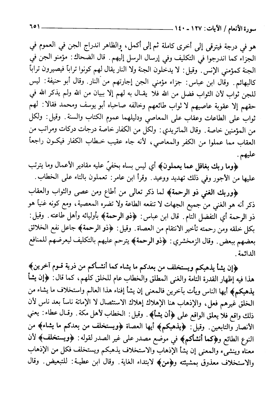 إِنْ يَشَأْ يُذْهِبْكُمْ وَيَسْتَخْلِفْ مِنْ بَعْدِكُمْ مَا يَشاءُ كَما أَنْشَأَكُمْ مِنْ ذُرِّيَّةِ قَوْمٍ آخَرِينَ هَذَا فِيهِ إِظْهَارُ الْقُدْرَةِ التَّامَّةِ وَالْغِنَى الْمُطْلَقِ وَالْخِطَابُ عَامٌّ لِلْخَلْقِ كُلِّهِمْ، كَمَا قَالَ: إِنْ يَشَأْ يُذْهِبْكُمْ أَيُّهَا النَّاسُ وَيَأْتِ بِآخَرِينَ فَالْمَعْنَى إِنْ يَشَأْ إِفْنَاءَ هَذَا الْعَالَمِ وَاسْتِخْلَافَ مَا يَشَاءُ مِنَ الْخَلْقِ غَيْرَهِمْ فَعَلَ، وَالْإِذْهَابَ هُنَا الْإِهْلَاكُ إِهْلَاكُ الِاسْتِئْصَالٍ لَا الْإِمَاتَةُ نَاسًا بَعْدَ نَاسٍ لِأَنَّ ذَلِكَ وَاقِعٌ فَلَا يُعَلَّقُ الْوَاقِعُ عَلَى إِنْ يَشَأْ. وَقِيلَ: الْخِطَابُ لِأَهْلِ مَكَّةَ. وَقَالَ عَطَاءٌ: يَعْنِي الْأَنْصَارَ وَالتَّابِعِينَ. وَقِيلَ: يُذْهِبْكُمْ أَيُّهَا الْعُصَاةُ وَيَسْتَخْلِفْ مِنْ بَعْدِكُمْ مَا يَشاءُ مِنَ النَّوْعِ الطَّائِعِ وكَما أَنْشَأَكُمْ فِي مَوْضِعِ مَصْدَرٌ عَلَى غَيْرِ الصَّدْرِ لِقَوْلِهِ: وَيَسْتَخْلِفْ لِأَنَّ مَعْنَاهُ وَيُنْشِئْ وَالْمَعْنَى إِنْ يَشَأِ الْإِذْهَابَ وَالِاسْتِخْلَافَ يُذْهِبْكُمْ وَيَسْتَخْلِفْ فَكُلٌّ مِنَ الْإِذْهَابِ وَالِاسْتِخْلَافِ مَعْذُوقٌ بمشيئته ومِنْ لِابْتِدَاءِ الْغَايَةِ. وَقَالَ ابْنُ عَطِيَّةَ: لِلتَّبْعِيضِ. وَقَالَ
