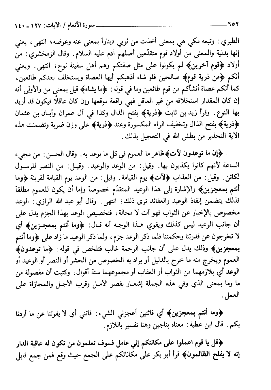 إِنَّ مَا تُوعَدُونَ لَآتٍ ظَاهِرُ مَا الْعُمُومِ فِي كُلِّ مَا يُوعَدُ بِهِ. وَقَالَ الْحَسَنُ: مِنْ مَجِيءِ السَّاعَةِ لِأَنَّهُمْ كَانُوا يُكَذِّبُونَ بِهَا. وَقِيلَ: مِنَ الْوَعْدِ وَالْوَعِيدِ. وَقِيلَ: مِنَ النَّصْرِ لِلرَّسُولِ لَكَائِنٌ. وَقِيلَ: مِنَ الْعَذَابِ لَآتٍ يَوْمَ الْقِيَامَةِ. وَقِيلَ: مِنَ الْوَعْدِ يَوْمَ الْقِيَامَةِ لِقَرِينَةِ وَما أَنْتُمْ بِمُعْجِزِينَ وَالْإِشَارَةُ إِلَى هَذَا الْوَعِيدِ الْمُتَقَدِّمِ خُصُوصًا وَإِمَّا أَنْ يَكُونَ لِلْعُمُومِ مُطْلَقًا فَذَلِكَ يَتَضَمَّنُ إِنْفَاذَ الوعيد والعقائد ترى ذَلِكَ انْتَهَى. وَقَالَ أَبُو عَبْدِ اللَّهِ الرَّازِيُّ: الْوَعْدُ مَخْصُوصٌ بِالْإِخْبَارِ عَنِ الثَّوَابِ فَهُوَ آتٍ لَا مَحَالَةَ، فَتَخْصِيصُ الْوَعْدِ بِهَذَا الْجَزْمِ يَدُلُّ عَلَى أَنَّ جَانِبَ الْوَعِيدِ لَيْسَ كَذَلِكَ وَيُقَوِّي هَذَا الْوَجْهَ أَنَّهُ قَالَ: وَما أَنْتُمْ بِمُعْجِزِينَ أَيْ لَا تَخْرُجُونَ عَنْ قُدْرَتِنَا وَحِكْمَتِنَا فَلَمَّا ذَكَرَ الْوَعْدَ جَزَمَ، وَلَمَّا ذَكَرَ الْوَعِيدَ مَا زَادَ عَلَى وَما أَنْتُمْ بِمُعْجِزِينَ وَذَلِكَ يَدُلُّ عَلَى أَنَّ جَانِبَ الرَّحْمَةِ غَالِبٌ فَتَلَخَّصَ فِي قَوْلِهِ: مَا تُوعَدُونَ الْعُمُومُ وَيَخْرُجُ مِنْهُ مَا خَرَجَ بِالدَّلِيلِ أَوْ يُرَادُ بِهِ الْخُصُوصُ مِنَ الْحَشْرِ أَوِ النَّصْرِ أَوِ الْوَعِيدِ أَوِ الْوَعْدِ أَيْ بِلَازِمِهِمَا مِنَ الثَّوَابِ أَوِ الْعِقَابِ أَوْ مَجْمُوعِهِمَا سِتَّةُ أَقْوَالٍ. وَكُتِبَتْ أَنَّ مَفْصُولَةً مِنْ مَا وَمَا بِمَعْنَى الَّذِي وَفِي هَذِهِ الْجُمْلَةِ إِشْعَارٌ بِقَصْرِ الْأَمَلِ وَقُرْبِ الْأَجَلِ وَالْمُجَازَاةِ عَلَى الْعَمَلِ.