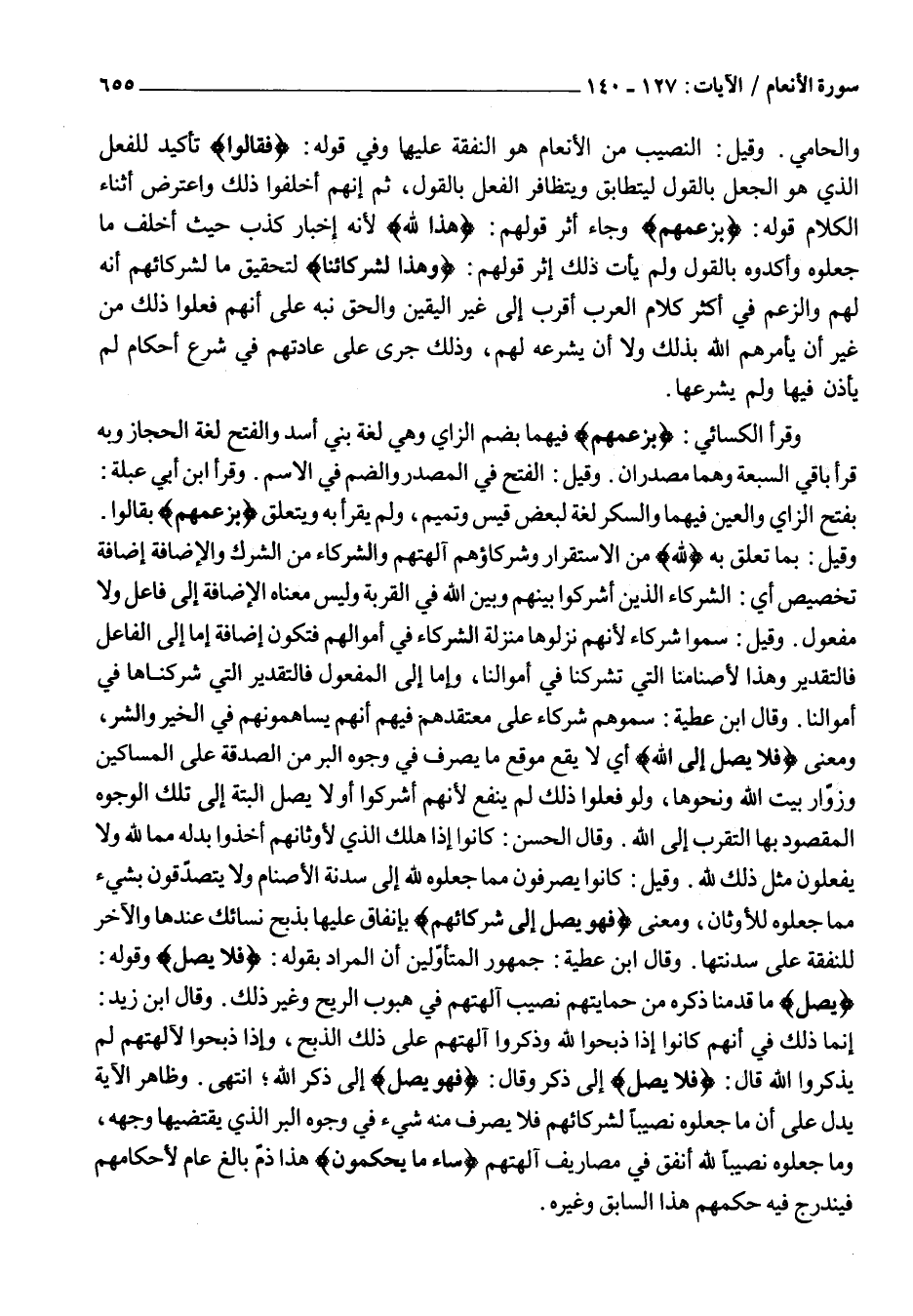 وَالْحَامِي. وَقِيلَ: النَّصِيبُ مِنَ الْأَنْعَامِ هُوَ النَّفَقَةُ عَلَيْهَا وَفِي قَوْلِهِ: فَقالُوا تَأْكِيدٌ لِلْفِعْلِ الَّذِي هُوَ الْجَعْلُ بِالْقَوْلِ لِيَتَطَابَقَ وَيَتَظَافَرَ الْفِعْلُ بِالْقَوْلِ، ثُمَّ إِنَّهُمْ أَخْلَفُوا ذَلِكَ وَاعْتَرَضَ أَثْنَاءَ الْكَلَامِ قَوْلُهُ: بِزَعْمِهِمْ وَجَاءَ إِثْرَ قَوْلِهِمْ: هَذَا لِلَّهِ لِأَنَّهُ إِخْبَارُ كَذِبٍ حَيْثُ أَخْلَفَ مَا جَعَلُوهُ وَأَكَّدُوهُ بِالْقَوْلِ وَلَمْ يَأْتِ ذَلِكَ إِثْرَ قَوْلِهِمْ: وَهذا لِشُرَكائِنا لِتَحْقِيقِ مَا لِشُرَكَائِهِمْ أَنَّهُ لَهُمْ وَالزَّعْمُ فِي أَكْثَرِ كَلَامِ الْعَرَبِ أَقْرَبُ إِلَى غَيْرِ الْيَقِينِ وَالْحَقُّ نَبَّهَ عَلَى أَنَّهُمْ فَعَلُوا ذَلِكَ مِنْ غَيْرِ أَنْ يَأْمُرَهُمُ اللَّهُ بِذَلِكَ وَلَا أَنْ يُشَرِّعَهُ لَهُمْ، وَذَلِكَ جَرْيٌ عَلَى عَادَتِهِمْ فِي شَرْعِ أَحْكَامٍ لَمْ يَأْذَنْ فِيهَا وَلَمْ يُشَرِّعْهَا.