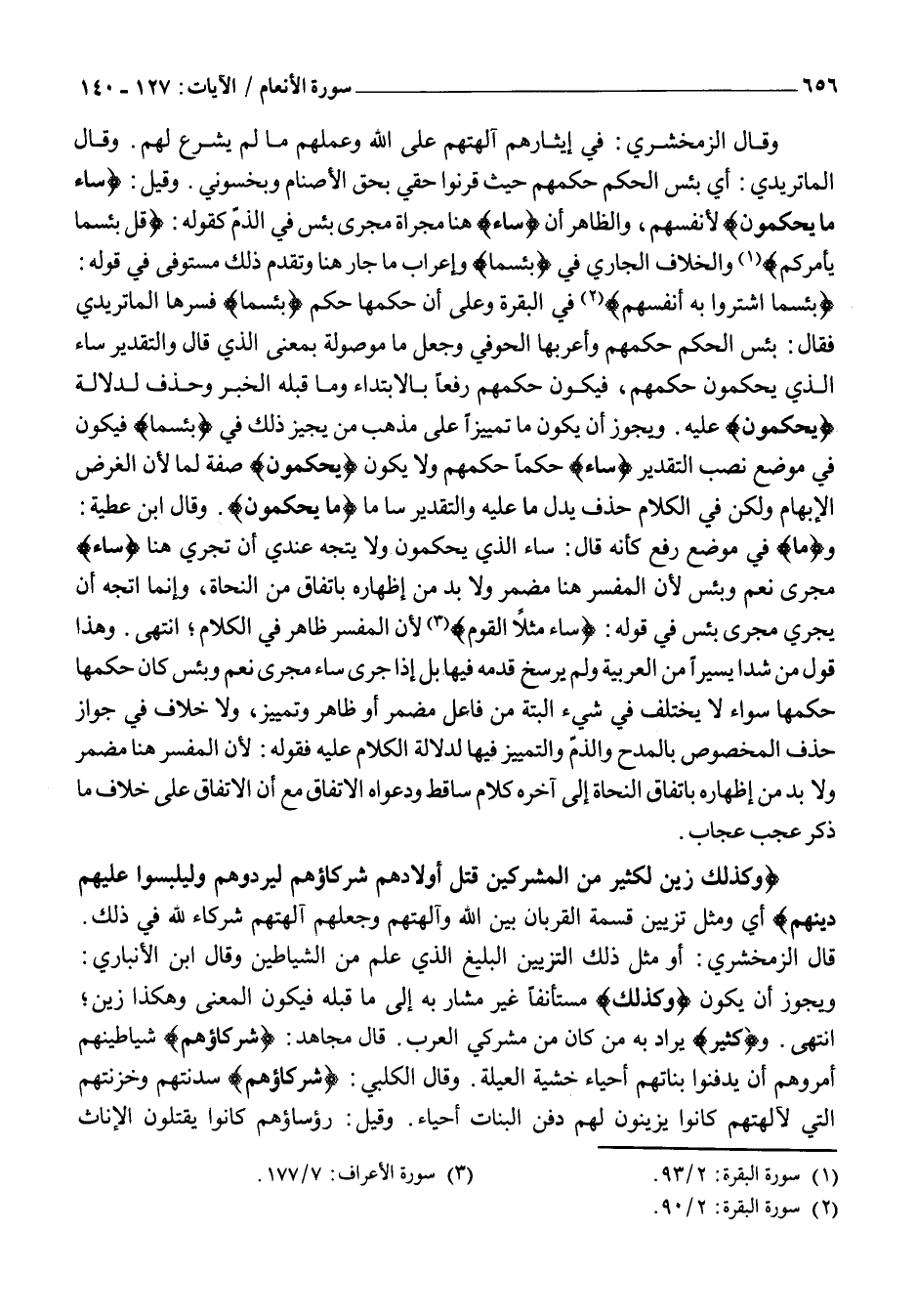 وَكَذلِكَ زَيَّنَ لِكَثِيرٍ مِنَ الْمُشْرِكِينَ قَتْلَ أَوْلادِهِمْ شُرَكاؤُهُمْ لِيُرْدُوهُمْ وَلِيَلْبِسُوا عَلَيْهِمْ دِينَهُمْ أَيْ وَمِثْلُ تَزْيِينِ قِسْمَةِ الْقُرْبَانِ بَيْنَ اللَّهِ وَآلِهَتِهِمْ وَجَعْلِهِمْ آلِهَتَهُمْ شُرَكَاءَ لِلَّهِ فِي ذَلِكَ.