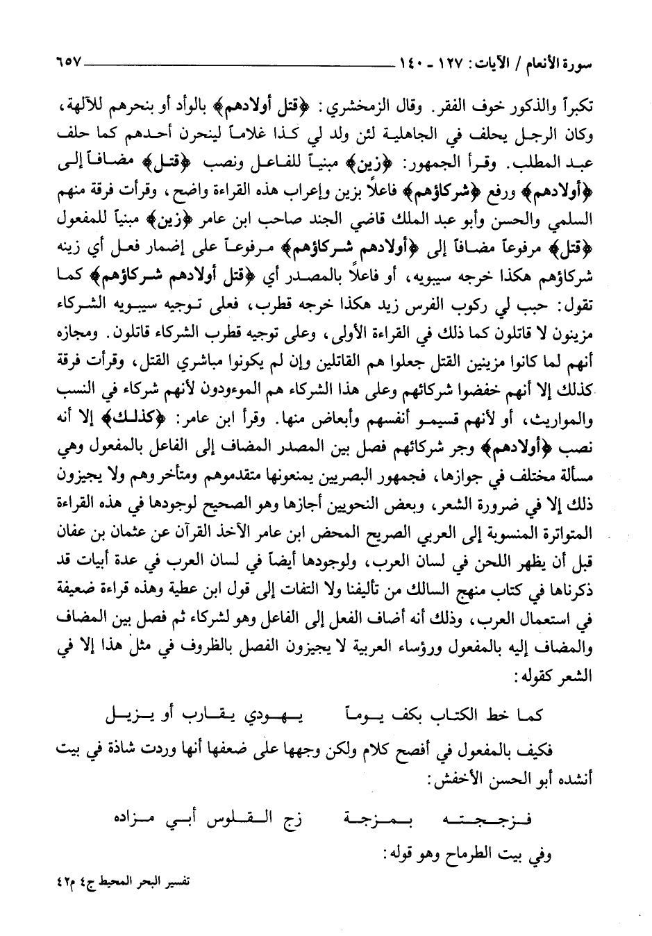 تَكَبُّرًا وَالذُّكُورَ خَوْفَ الْفَقْرِ. وَقَالَ الزَّمَخْشَرِيُّ: قَتْلَ أَوْلادِهِمْ بِالْوَأْدِ أَوْ بِنَحْرِهِمْ لِلْآلِهَةِ، وَكَانَ الرَّجُلُ يَحْلِفُ فِي الجاهلية لئن ولد لي كَذَا غُلَامًا لَيَنْحَرَنَّ أَحَدَهُمْ كَمَا حَلَفَ عَبْدُ الْمَطْلَبِ. وَقَرَأَ الْجُمْهُورُ: زَيَّنَ مَبْنِيًّا لِلْفَاعِلِ وَنَصْبَ قَتْلَ مُضَافًا إِلَى أَوْلادِهِمْ وَرَفْعَ شُرَكاؤُهُمْ فَاعِلًا بِزَيَّنَ وَإِعْرَابُ هَذِهِ الْقِرَاءَةِ وَاضِحٌ، وَقَرَأَتْ فِرْقَةٌ مِنْهُمُ السُّلَمِيُّ وَالْحَسَنُ وَأَبُو عَبْدِ الْمَلِكِ قَاضِي الْجُنْدِ صَاحِبُ ابْنِ عَامِرٍ زَيَّنَ مَبْنِيًّا لِلْمَفْعُولِ قَتْلَ مَرْفُوعًا مُضَافًا إِلَى أَوْلادِهِمْ شُرَكاؤُهُمْ مَرْفُوعًا عَلَى إِضْمَارِ فِعْلٍ أَيْ زَيَّنَهُ شُرَكَاؤُهُمْ هَكَذَا خَرَّجَهُ سِيبَوَيْهِ، أَوْ فَاعِلًا بِالْمَصْدَرِ أَيْ قَتْلَ أَوْلادِهِمْ شُرَكاؤُهُمْ كَمَا تَقُولُ: حُبِّبَ لِي رُكُوبُ الْفَرَسِ زِيدٌ هَكَذَا خَرَّجَهُ قُطْرُبٌ، فَعَلَى تَوْجِيهِ سِيبَوَيْهِ الشُّرَكَاءُ مُزَيِّنُونَ لَا قَاتِلُونَ كَمَا ذَلِكَ فِي الْقِرَاءَةِ الْأُولَى، وَعَلَى تَوْجِيهِ قُطْرُبٍ الشُّرَكَاءُ قَاتِلُونَ. وَمَجَازُهُ أَنَّهُمْ لَمَّا كَانُوا مُزَيِّنِينَ الْقَتْلَ جُعِلُوا هُمُ الْقَاتِلِينَ وَإِنْ لَمْ يَكُونُوا مُبَاشَرِي الْقَتْلِ، وَقَرَأَتْ فِرْقَةٌ كَذَلِكَ إِلَّا أَنَّهُمْ خَفَضُوا شُرَكَائِهِمْ وَعَلَى هَذَا الشُّرَكَاءُ هم الموءودون لِأَنَّهُمْ شُرَكَاءُ فِي النَّسَبِ وَالْمَوَارِيثِ، أَوْ لِأَنَّهُمْ قَسِيمُو أَنْفُسِهِمْ وَأَبْعَاضٌ مِنْهَا. وَقَرَأَ ابْنُ عَامِرٍ: كَذلِكَ إِلَّا أَنَّهُ نَصَبَ أَوْلادِهِمْ وَجَرَّ شركائهم فَصَلَ بَيْنَ الْمَصْدَرِ الْمُضَافِ إِلَى الْفَاعِلِ بِالْمَفْعُولِ وَهِيَ مَسْأَلَةٌ مُخْتَلَفٌ فِي جَوَازِهَا، فَجُمْهُورُ الْبَصْرِيِّينَ يَمْنَعُونَهَا مُتَقَدِّمُوهُمْ وَمُتَأَخَّرُوهُمْ وَلَا يُجِيزُونَ ذَلِكَ إِلَّا فِي ضَرُورَةٍ الشِّعْرِ، وَبَعْضُ النَّحْوِيِّينَ أَجَازَهَا وَهُوَ الصَّحِيحُ لِوُجُودِهَا فِي هَذِهِ الْقِرَاءَةِ الْمُتَوَاتِرَةِ الْمَنْسُوبَةِ إِلَى الْعَرَبِيِّ الصَّرِيحِ الْمَحْضِ ابْنِ عَامِرٍ الْآخِذِ الْقُرْآنِ عَنْ عُثْمَانَ بْنِ عَفَّانَ قَبْلَ أَنْ يَظْهَرَ اللَّحْنُ فِي لِسَانِ الْعَرَبِ، وَلِوُجُودِهَا أَيْضًا فِي لِسَانِ الْعَرَبِ فِي عِدَّةِ أَبْيَاتٍ قَدْ ذَكَرْنَاهَا فِي كِتَابِ مَنْهَجِ السَّالِكِ مِنْ تَأْلِيفِنَا وَلَا الْتِفَاتَ إِلَى قَوْلِ ابْنِ عَطِيَّةَ وَهَذِهِ قِرَاءَةٌ ضَعِيفَةٌ فِي اسْتِعْمَالِ الْعَرَبِ، وَذَلِكَ أَنَّهُ أَضَافَ الْفِعْلَ إِلَى الْفَاعِلِ وهو لشركاء ثُمَّ فَصَلَ بَيْنَ الْمُضَافِ وَالْمُضَافِ إِلَيْهِ بِالْمَفْعُولِ وَرُؤَسَاءُ الْعَرَبِيَّةِ لَا يُجِيزُونَ الْفَصْلَ بِالظُّرُوفِ فِي مِثْلِ هَذَا إِلَّا فِي الشِّعْرِ كَقَوْلِهِ: