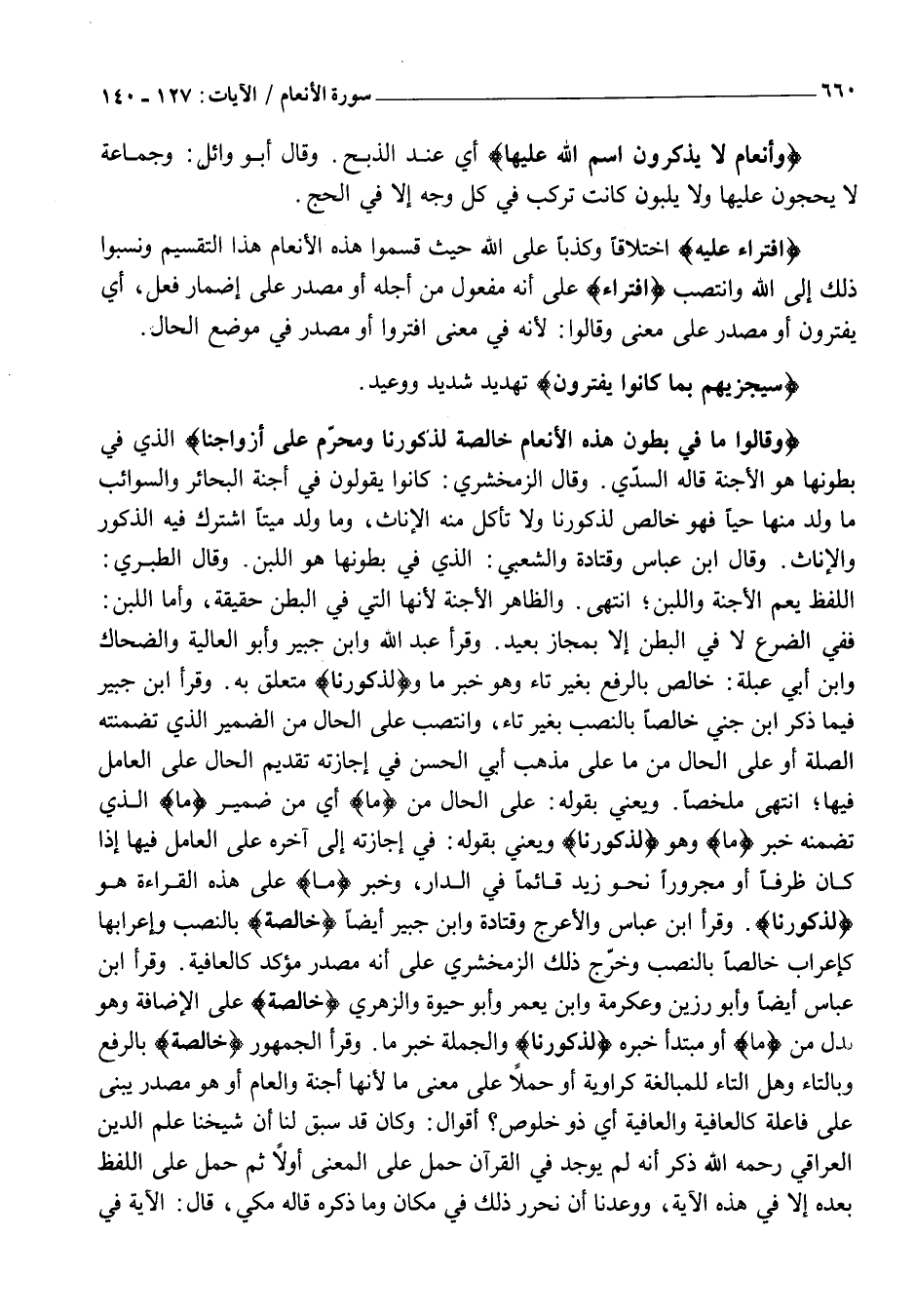 فَفِي الضَّرْعِ لَا فِي الْبَطْنِ إِلَّا بِمَجَازٍ بَعِيدٍ. وَقَرَأَ عَبْدُ اللَّهِ وَابْنُ جُبَيْرٍ وَأَبُو الْعَالِيَةَ وَالضَّحَّاكُ وَابْنُ أَبِي عَبْلَةَ: خَالِصٌ بِالرَّفْعِ بِغَيْرِ تَاءٍ وَهُوَ خَبَرُ ما ولِذُكُورِنا مُتَعَلِّقٌ بِهِ. وَقَرَأَ ابْنُ جُبَيْرٍ فِيمَا ذَكَرَ ابْنُ جِنِّيٍّ خَالِصًا بِالنَّصْبِ بِغَيْرِ تَاءٍ، وَانْتَصَبَ عَلَى الْحَالِ مِنَ الضَّمِيرِ الَّذِي تَضَمَّنَتْهُ الصِّلَةُ أَوْ عَلَى الْحَالِ مِنْ مَا عَلَى مَذْهَبِ أَبِي الْحَسَنِ فِي إِجَازَتِهِ تَقْدِيمَ الْحَالِ عَلَى الْعَامِلِ فِيهَا انْتَهَى مُلَخَّصًا. وَيَعْنِي بِقَوْلِهِ: عَلَى الْحَالِ مِنْ مَا أَيْ مِنْ ضَمِيرِ مَا الَّذِي تَضَمَّنَهُ خَبَرُ مَا وَهُوَ لِذُكُورِنا وَيَعْنِي بِقَوْلِهِ: فِي إِجَازَتِهِ إِلَى آخِرِهِ عَلَى الْعَامِلِ فِيهَا إِذَا كَانَ ظَرْفًا أَوْ مَجْرُورًا نَحْوَ زَيْدٌ قَائِمًا فِي الدَّارِ، وَخَبَرُ مَا عَلَى هَذِهِ الْقِرَاءَةِ هُوَ لِذُكُورِنا. وَقَرَأَ ابْنُ عَبَّاسٍ وَالْأَعْرَجُ وَقَتَادَةُ وَابْنُ جُبَيْرٍ أَيْضًا خَالِصَةٌ بِالنَّصْبِ وَإِعْرَابُهَا كَإِعْرَابِ خَالِصًا بِالنَّصْبِ وَخَرَّجَ ذَلِكَ الزَّمَخْشَرِيُّ عَلَى أَنَّهُ مَصْدَرٌ مُؤَكَّدٌ كَالْعَافِيَةِ. وَقَرَأَ ابْنُ عَبَّاسٍ أَيْضًا وَأَبُو رَزِينٍ وَعِكْرِمَةُ وَابْنُ يَعْمُرَ وَأَبُو حَيْوَةَ وَالزَّهْرِيُّ خَالِصَةٌ عَلَى الْإِضَافَةِ وَهُوَ بَدَلٌ مِنْ مَا أَوْ مُبْتَدَأٌ خَبَرُهُ لِذُكُورِنا وَالْجُمْلَةُ خَبَرُ مَا. وَقَرَأَ الْجُمْهُورُ خالِصَةٌ بِالرَّفْعِ وَبِالتَّاءِ وَهَلِ التَّاءُ لِلْمُبَالَغَةِ كَرَاوِيَةٍ أَوْ حَمْلًا عَلَى مَعْنَى مَا لِأَنَّهَا أَجِنَّةٌ وَالْعَامُّ أَوْ هُوَ مَصْدَرٌ يُبْنَى عَلَى فَاعِلَةٍ كالعافية والعافية أَيْ ذُو خُلُوصٍ؟ أَقْوَالٌ: وَكَانَ قَدْ سَبَقَ لَنَا أَنَّ شَيْخَنَا عَلَمَ الدِّينِ الْعِرَاقِيَّ رَحِمَهُ اللَّهُ ذَكَرَ أَنَّهُ لَمْ يُوجَدْ فِي الْقُرْآنِ حَمْلٌ عَلَى الْمَعْنَى أَوَّلًا ثُمَّ حَمْلٌ عَلَى اللَّفْظِ بَعْدَهُ إِلَّا فِي هَذِهِ الْآيَةِ، وَوَعَدَنَا أَنْ نُحَرِّرَ ذَلِكَ فِي مَكَانٍ وَمَا ذَكَرَهُ قَالَهُ مَكِّيٌّ، قَالَ: الْآيَةُ فِي