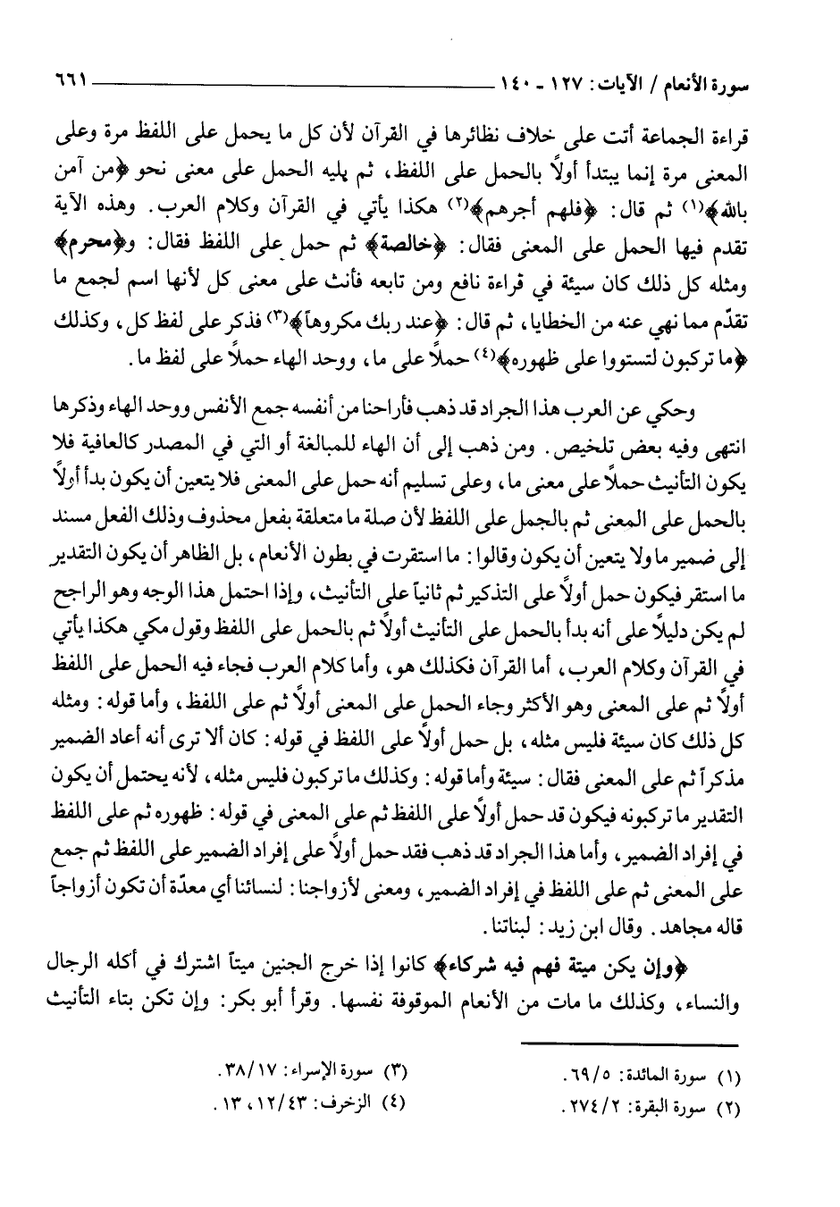 وَحُكِيَ عَنِ الْعَرَبِ هَذَا الْجَرَادُ قَدْ ذَهَبَ فَأَرَاحَنَا مِنْ أَنْفُسِهِ جَمَعَ الْأَنْفُسَ وَوَحَّدَ الْهَاءَ وَذَكَّرَهَا انْتَهَى وَفِيهِ بَعْضُ تَلْخِيصٍ. وَمَنْ ذَهَبَ إِلَى أَنَّ الْهَاءَ لِلْمُبَالَغَةِ أَوِ الَّتِي فِي الْمَصْدَرِ كَالْعَافِيَةِ فَلَا يَكُونُ التَّأْنِيثُ حَمْلًا عَلَى مَعْنَى مَا، وَعَلَى تَسْلِيمٍ أَنَّهُ حُمِلَ عَلَى الْمَعْنَى فَلَا يَتَعَيَّنُ أَنْ يَكُونَ بَدَأَ أَوَّلًا بِالْحَمْلِ عَلَى الْمَعْنَى ثُمَّ بالجمل عَلَى اللَّفْظِ لِأَنَّ صِلَةَ مَا مُتَعَلِّقَةٌ بِفِعْلٍ مَحْذُوفٍ وَذَلِكَ الْفِعْلُ مُسْنَدٌ إِلَى ضَمِيرِ مَا وَلَا يَتَعَيَّنُ أَنْ يَكُونَ وَقَالُوا: مَا اسْتَقَرَّتْ فِي بُطُونِ الْأَنْعَامِ، بَلِ الظَّاهِرُ أَنْ يَكُونَ التَّقْدِيرُ مَا اسْتَقَرَّ فَيَكُونُ حُمِلَ أَوَّلًا عَلَى التَّذْكِيرِ ثُمَّ ثَانِيًا عَلَى التَّأْنِيثِ، وَإِذَا احْتَمَلَ هَذَا الْوَجْهَ وَهُوَ الرَّاجِحُ لَمْ يَكُنْ دَلِيلًا عَلَى أَنَّهُ بَدَأَ بِالْحَمْلِ عَلَى التَّأْنِيثِ أَوَّلًا ثُمَّ بِالْحَمْلِ عَلَى اللَّفْظِ وَقَوْلُ مَكِّيٍّ هَكَذَا يَأْتِي فِي الْقُرْآنِ وَكَلَامِ الْعَرَبِ، أَمَّا الْقُرْآنُ فَكَذَلِكَ هُوَ، وَأَمَّا كَلَامُ الْعَرَبِ فَجَاءَ فِيهِ الْحَمْلِ عَلَى اللَّفْظِ أَوَّلًا ثُمَّ عَلَى الْمَعْنَى وَهُوَ الْأَكْثَرُ وَجَاءَ الْحَمْلُ عَلَى الْمَعْنَى أَوَّلًا ثُمَّ عَلَى اللَّفْظِ، وَأَمَّا قَوْلُهُ: وَمِثْلُهُ كُلُّ ذَلِكَ كَانَ سَيِّئَةً فَلَيْسَ مِثْلَهُ، بَلْ حُمِلَ أَوَّلًا عَلَى اللَّفْظِ فِي قَوْلِهِ: كَانَ أَلَا تَرَى أَنَّهُ أَعَادَ الضَّمِيرَ مُذَكَّرًا ثُمَّ عَلَى الْمَعْنَى فَقَالَ: سَيِّئَةً وَأَمَّا قَوْلُهُ: وَكَذَلِكَ مَا تَرْكَبُونَ فَلَيْسَ مِثْلَهُ، لِأَنَّهُ يُحْتَمَلُ أَنْ يَكُونَ التَّقْدِيرُ مَا تَرْكَبُونَهُ فَيَكُونُ قَدْ حُمِلَ أَوَّلًا عَلَى اللَّفْظِ ثُمَّ عَلَى الْمَعْنَى فِي قَوْلِهِ: ظُهُورُهُ ثُمَّ عَلَى اللَّفْظِ فِي إِفْرَادِ الضَّمِيرِ، وَأَمَّا هَذَا الْجَرَادُ قَدْ ذَهَبَ فَقَدْ حُمِلَ أَوَّلًا عَلَى إِفْرَادِ الضَّمِيرِ عَلَى اللَّفْظِ ثُمَّ جُمِعَ عَلَى الْمَعْنَى ثُمَّ عَلَى اللَّفْظِ فِي إِفْرَادِ الضَّمِيرِ، وَمَعْنَى لِأَزْوَاجِنَا: لِنِسَائِنَا أَيْ مُعَدَّةٌ أَنْ تَكُونَ أَزْوَاجًا قَالَهُ مُجَاهِدٍ. وَقَالَ ابْنُ زَيْدٍ: لِبَنَاتِنَا.