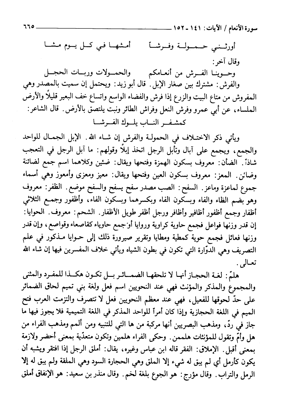 كَمَشْفَرِ النَّابِ يَلُوكُ الْفَرْشَا وَيَأْتِيَ ذِكْرُ الِاخْتِلَافِ فِي الْحَمُولَةِ وَالْفَرْشِ إِنْ شَاءَ اللَّهُ. الْإِبِلُ الْجِمَالُ لِلْوَاحِدِ وَالْجَمْعِ، وَيُجْمَعُ عَلَى آبَالٍ وَتَأَبَّلَ الرَّجُلُ اتَّخَذَ إِبِلًا وَقَوْلُهُمْ: مَا آبَلَ الرَّجُلَ فِي التَّعَجُّبِ شَاذًّا. الضَّأْنُ: مَعْرُوفٌ بِسُكُونِ الْهَمْزَةِ وَفَتْحِهَا وَيُقَالُ: ضَئِينٌ وَكِلَاهُمَا اسْمُ جَمْعٍ لِضَائِنَةٍ وَضَائِنٍ. الْمَعْزُ: مَعْرُوفٌ بِسُكُونِ الْعَيْنِ وَفَتْحِهَا وَيُقَالُ: مَعِيزٌ وَمَعْزَى وَأُمْعُوزٌ وَهِيَ أَسْمَاءُ جُمُوعٍ لِمَاعِزَةٍ وَمَاعِزٍ. السَّفْحُ: الصَّبُّ مَصْدَرُ سَفَحَ يَسْفَحُ وَالسَّفْحُ مَوْضِعٌ. الظُّفْرُ: مَعْرُوفٌ وَهُوَ بِضَمِّ الظَّاءِ وَالْفَاءِ وَبِسُكُونِ الْفَاءِ وَبِكَسْرِهِمَا وَبِسُكُونِ الْفَاءِ، وَأُظْفُورٌ وَجَمْعُ الثُّلَاثِيِّ أَظْفَارٌ وَجَمْعُ أُظْفُورٍ أَظَافِيرُ وَأَظَافِرُ وَرَجُلٌ أَظْفَرُ طَوِيلُ الْأَظْفَارِ. الشَّحْمُ: مَعْرُوفٌ. الْحَوَايَا: