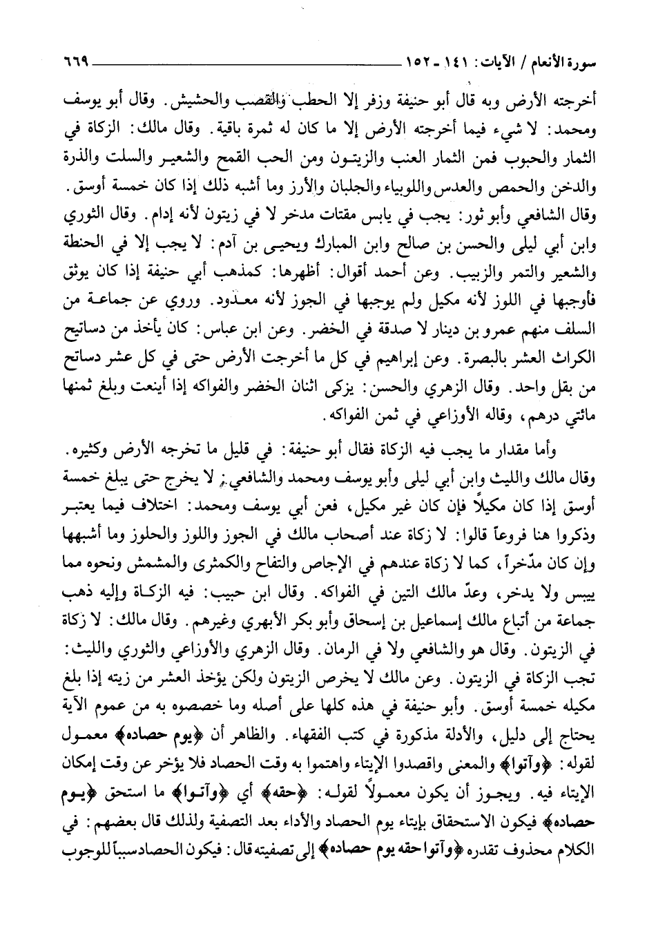 تَجِبُ الزَّكَاةُ فِي الزَّيْتُونِ. وَعَنْ مَالِكٍ لَا يُخْرَصُ الزَّيْتُونُ وَلَكِنْ يُؤْخَذُ الْعُشْرُ مِنْ زَيْتِهِ إِذَا بَلَغَ مَكِيلُهُ خَمْسَةَ أَوْسُقٍ. وَأَبُو حَنِيفَةَ فِي هَذِهِ كُلِّهَا عَلَى أَصْلِهِ وَمَا خَصَّصُوهُ بِهِ مِنْ عُمُومِ الْآيَةِ يَحْتَاجُ إِلَى دَلِيلٍ، وَالْأَدِلَّةُ مَذْكُورَةٌ فِي كُتُبِ الْفُقَهَاءِ. وَالظَّاهِرُ أَنَّ يَوْمَ حَصادِهِ مَعْمُولٌ لِقَوْلِهِ: وَآتُوا وَالْمَعْنَى وَاقْصُدُوا الْإِيتَاءَ وَاهْتَمُّوا بِهِ وَقْتَ الْحَصَادِ فَلَا يُؤَخَّرُ عَنْ وَقْتِ إِمْكَانِ الْإِيتَاءِ فِيهِ. وَيَجُوزُ أَنْ يَكُونَ مَعْمُولًا لِقَوْلِهِ: حَقَّهُ أَيْ وَآتُوا مَا اسْتُحِقَّ يَوْمَ حَصادِهِ فَيَكُونُ الِاسْتِحْقَاقُ بِإِيتَاءِ يَوْمِ الْحَصَادِ وَالْأَدَاءُ بَعْدَ التَّصْفِيَةِ وَلِذَلِكَ قَالَ بَعْضُهُمْ: فِي الْكَلَامِ محذوف تقدره وَآتُوا حَقَّهُ يَوْمَ حَصادِهِ إِلَى تَصْفِيَتِهِ قَالَ: فَيَكُونُ الْحَصَادُ سَبَبًا لِلْوُجُوبِ