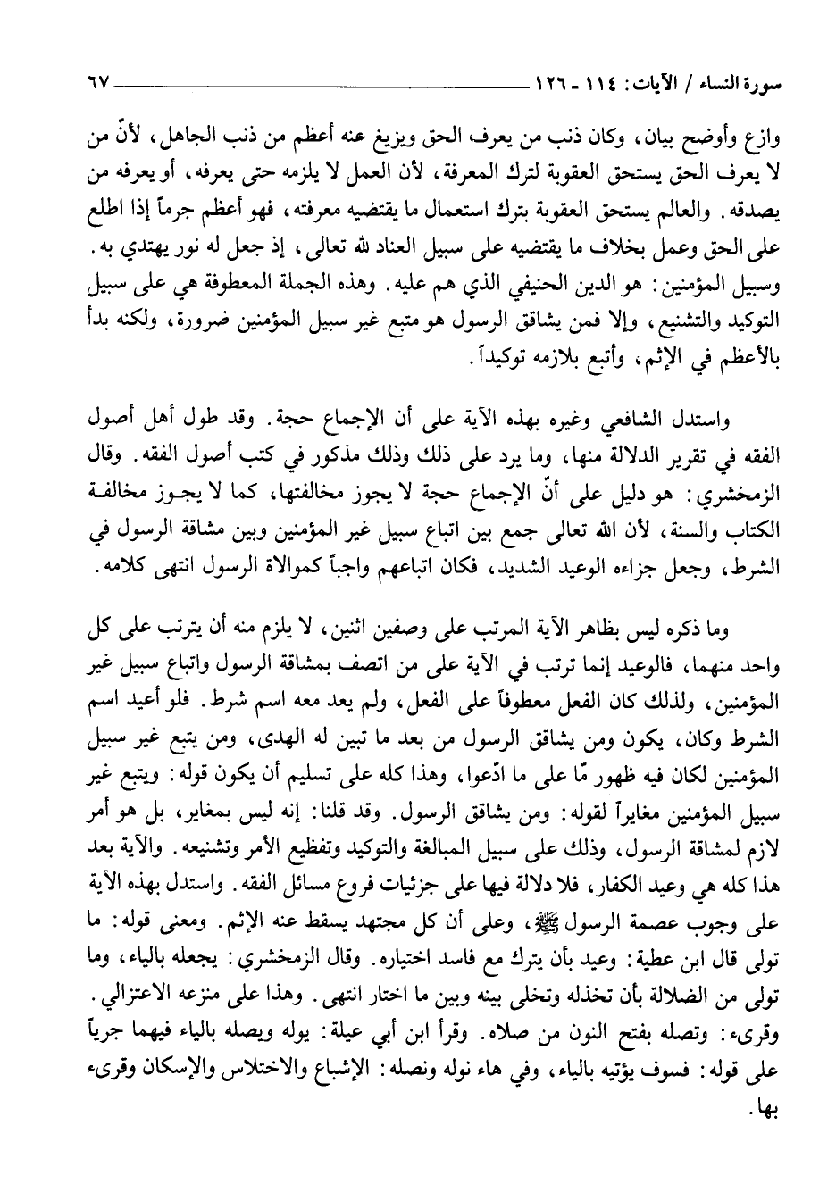 وَمَا ذَكَرَهُ لَيْسَ بِظَاهِرِ الْآيَةِ الْمُرَتَّبِ عَلَى وَصْفَيْنِ اثْنَيْنِ، لَا يَلْزَمُ مِنْهُ أَنْ يترتب عَلَى كُلِّ وَاحِدٍ مِنْهُمَا، فَالْوَعِيدُ إِنَّمَا تَرَتَّبَ فِي الْآيَةِ عَلَى مَنِ اتَّصَفَ بِمُشَاقَّةِ الرَّسُولِ وَاتِّبَاعِ سَبِيلِ غَيْرِ الْمُؤْمِنِينَ، وَلِذَلِكَ كَانَ الْفِعْلُ مَعْطُوفًا عَلَى الْفِعْلِ، وَلَمْ يُعَدْ مَعَهُ اسْمُ شَرْطٍ. فَلَوْ أُعِيدَ اسْمُ الشَّرْطِ وَكَأَنْ، يَكُونَ وَمَنْ يُشَاقِقِ الرَّسُولَ مِنْ بَعْدِ مَا تَبَيَّنَ لَهُ الْهُدَى، وَمَنْ يَتَّبِعْ غَيْرَ سَبِيلِ الْمُؤْمِنِينَ لَكَانَ فِيهِ ظُهُورُ مَا عَلَى مَا ادَّعَوْا، وَهَذَا كُلُّهُ عَلَى تَسْلِيمِ أَنْ يَكُونَ قَوْلُهُ: وَيَتَّبِعْ غَيْرَ سَبِيلِ الْمُؤْمِنِينَ مُغَايِرًا لِقَوْلِهِ: وَمَنْ يُشَاقِقِ الرَّسُولَ. وَقَدْ قُلْنَا: إِنَّهُ لَيْسَ بِمُغَايِرٍ، بَلْ هُوَ أَمْرٌ لَازِمٌ لِمُشَاقَّةِ الرَّسُولِ، وَذَلِكَ عَلَى سَبِيلِ الْمُبَالَغَةِ وَالتَّوْكِيدِ وَتَفْظِيعِ الْأَمْرِ وَتَشْنِيعِهِ. وَالْآيَةُ بَعْدَ هَذَا كُلِّهِ هِيَ وَعِيدُ الْكُفَّارِ، فَلَا دلالة فيها عَلَى جُزْئِيَّاتِ فُرُوعِ مَسَائِلِ الْفِقْهِ. وَاسْتُدِلَّ بِهَذِهِ الْآيَةِ عَلَى وُجُوبِ عِصْمَةِ الرَّسُولِ صَلَّى اللَّهُ عَلَيْهِ وَسَلَّمَ، وَعَلَى أَنَّ كُلَّ مُجْتَهِدٍ يَسْقُطُ عَنْهُ الْإِثْمُ. وَمَعْنَى قَوْلِهِ: مَا تَوَلَّى قَالَ ابْنُ عَطِيَّةَ: وَعِيدٌ بِأَنْ يَتْرُكَ مَعَ فَاسِدِ اخْتِيَارَهُ. وَقَالَ الزَّمَخْشَرِيُّ: يَجْعَلُهُ بِالْيَاءِ، وَمَا تَوَلَّى مِنَ الضَّلَالَةِ بِأَنْ تَخْذُلَهُ وَتُخَلِّي بَيْنَهُ وَبَيْنَ مَا اخْتَارَ انْتَهَى. وَهَذَا عَلَى مَنْزَعِهِ الِاعْتِزَالِيِّ.
