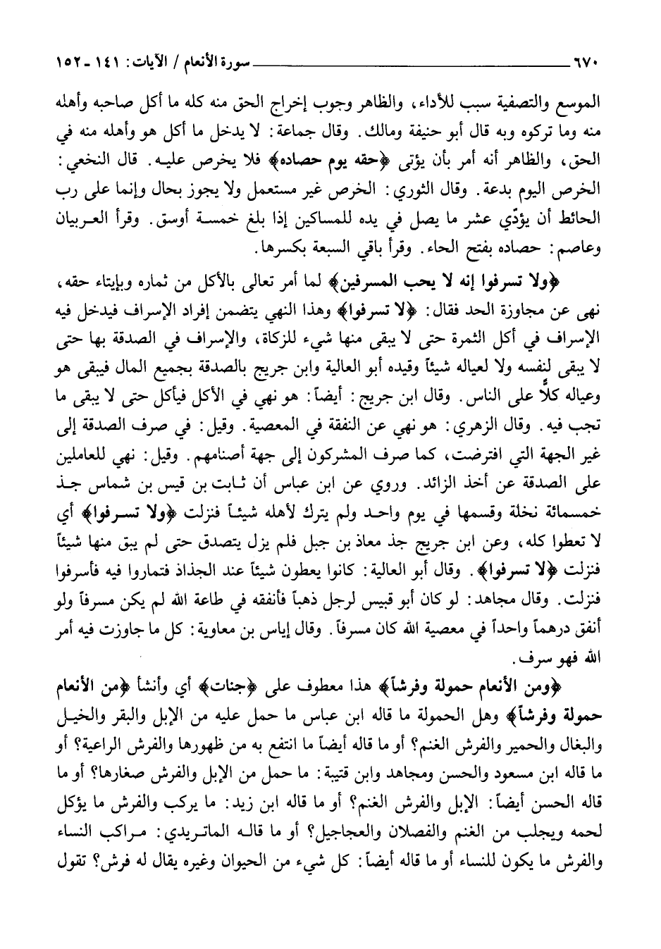 وَلا تُسْرِفُوا إِنَّهُ لَا يُحِبُّ الْمُسْرِفِينَ لَمَّا أَمَرَ تَعَالَى بِالْأَكْلِ مِنْ ثِمَارِهِ وَبِإِيتَاءِ حَقِّهِ، نَهَى عَنْ مُجَاوَزَةِ الْحَدِّ فَقَالَ: لَا تُسْرِفُوا وَهَذَا النَّهْيُ يَتَضَمَّنُ إِفْرَادَ الْإِسْرَافِ فَيَدْخُلُ فِيهِ الْإِسْرَافُ فِي أَكْلِ الثَّمَرَةِ حَتَّى لَا يَبْقَى مِنْهَا شَيْءٌ لِلزَّكَاةِ، وَالْإِسْرَافُ فِي الصَّدَقَةِ بِهَا حَتَّى لَا يُبْقِيَ لِنَفْسِهِ وَلَا لِعِيَالِهِ شَيْئًا وَقَيَّدَهُ أَبُو الْعَالِيَةِ وَابْنُ جُرَيْجٍ بِالصَّدَقَةِ بِجَمِيعِ الْمَالِ فَيَبْقَى هُوَ وَعِيَالُهُ كَلًّا عَلَى النَّاسِ. وَقَالَ ابْنُ جُرَيْجٍ: أَيْضًا: هُوَ نَهْيٌ فِي الْأَكْلِ فَيَأْكُلُ حَتَّى لَا يَبْقَى مَا تَجِبُ فِيهِ. وَقَالَ الزُّهْرِيُّ: هُوَ نَهْيٌ عَنِ النَّفَقَةِ فِي الْمَعْصِيَةِ. وَقِيلَ: فِي صَرْفِ الصَّدَقَةِ إِلَى غَيْرِ الْجِهَةِ الَّتِي افْتُرِضَتْ، كَمَا صَرَفَ الْمُشْرِكُونَ إِلَى جِهَةِ أَصْنَامِهِمْ. وَقِيلَ: نَهْيٌ لِلْعَامِلِينَ عَلَى الصَّدَقَةِ عَنْ أَخْذِ الزَّائِدِ. وَرُوِيَ عَنِ ابْنِ عَبَّاسٍ أَنَّ ثَابِتِ بْنِ قَيْسِ بْنِ شَمَّاسٍ جَذَّ خَمْسَمِائَةِ نَخْلَةٍ وَقَسَمَهَا فِي يَوْمٍ وَاحِدٍ وَلَمْ يَتْرُكْ لِأَهْلِهِ شَيْئًا فَنَزَلَتْ وَلا تُسْرِفُوا أَيْ لَا تُعْطُوا كُلَّهُ، وَعَنِ ابْنِ جُرَيْجٍ جَذَّ مُعَاذُ بْنُ جَبَلٍ فَلَمْ يَزَلْ يَتَصَدَّقُ حَتَّى لَمْ يبق منها شيئا فَنَزَلَتْ لَا تُسْرِفُوا. وَقَالَ أَبُو الْعَالِيَةِ: كَانُوا يُعْطُونَ شَيْئًا عِنْدَ الْجِذَاذِ فَتَمَارَوْا فِيهِ فَأَسْرَفُوا فَنَزَلَتْ. وَقَالَ مُجَاهِدٌ: لَوْ كَانَ أَبُو قَبِيسٍ لِرَجُلٍ ذَهَبًا فَأَنْفَقَهُ فِي طَاعَةِ اللَّهِ لَمْ يَكُنْ مُسْرِفًا وَلَوْ أَنْفَقَ دِرْهَمًا وَاحِدًا فِي مَعْصِيَةِ اللَّهِ كَانَ مُسْرِفًا. وَقَالَ إِيَاسُ بْنُ مُعَاوِيَةَ: كُلُّ مَا جَاوَزْتَ فِيهِ أَمْرَ اللَّهِ فَهُوَ سَرَفٌ.