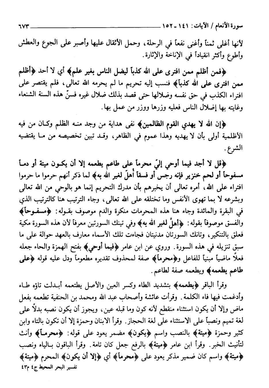 قُلْ لَا أَجِدُ فِي مَا أُوحِيَ إِلَيَّ مُحَرَّماً عَلى طاعِمٍ يَطْعَمُهُ إِلَّا أَنْ يَكُونَ مَيْتَةً أَوْ دَماً مَسْفُوحاً أَوْ لَحْمَ خِنزِيرٍ فَإِنَّهُ رِجْسٌ أَوْ فِسْقاً أُهِلَّ لِغَيْرِ اللَّهِ بِهِ لَمَّا ذَكَرَ أَنَّهُمْ حَرَّمُوا مَا حَرَّمُوا افْتِرَاءً عَلَى اللَّهِ، أَمَرَهُ تَعَالَى أَنْ يُخْبِرَهُمْ بِأَنَّ مُدْرِكَ التَّحْرِيمِ إِنَّمَا هُوَ بِالْوَحْيِ مِنَ اللَّهِ تَعَالَى وَبِشَرْعِهِ لَا بِمَا تَهْوَى الْأَنْفُسُ وَمَا تَخْتَلِقُهُ عَلَى اللَّهِ تَعَالَى، وَجَاءَ التَّرْتِيبُ هُنَا كَالتَّرْتِيبِ الَّذِي فِي الْبَقَرَةِ وَالْمَائِدَةِ وَجَاءَ هُنَا هَذِهِ الْمُحْرِمَاتُ مُنَكَّرَةً وَالدَّمُ مَوْصُوفٌ بِقَوْلِهِ: مَسْفُوحاً وَالْفِسْقُ مَوْصُوفًا بِقَوْلِهِ: أُهِلَّ لِغَيْرِ اللَّهِ بِهِ وَفِي تِينِكِ السُّورَتَيْنِ مُعَرَّفًا لِأَنَّ هَذِهِ السُّورَةَ مَكِّيَّةٌ فَعُلِّقَ بِالتَّنْكِيرِ، وَتَانِكَ السُّورَتَانِ مَدَنِيَّتَانِ فَجَاءَتْ تِلْكَ الْأَسْمَاءُ مَعَارِفَ بِالْعَهْدِ حُوَالَةً عَلَى مَا سَبَقَ تَنْزِيلُهُ فِي هَذِهِ السُّورَةِ. وَرُوِيَ عَنِ ابْنِ عَامِرٍ فِي مَا أُوحِيَ بِفَتْحِ الْهَمْزَةِ وَالْحَاءِ جَعَلَهُ فِعْلًا مَاضِيًا مَبْنِيًّا لِلْفَاعِلِ ومُحَرَّماً صِفَةً لِمَحْذُوفٍ تَقْدِيرُهُ مَطْعُومًا وَدَلَّ عَلَيْهِ قَوْلُهُ عَلى طاعِمٍ يَطْعَمُهُ وَيَطْعَمُهُ صِفَةٌ لِطَاعِمٍ.