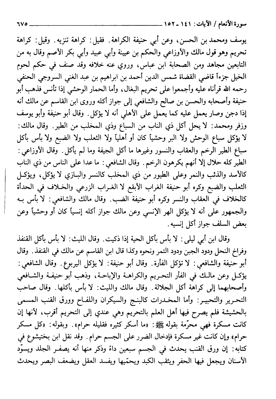 يُوسُفَ وَمُحَمَّدُ بْنُ الْحَسَنِ، وَعَنْ أَبِي حَنِيفَةَ الْكَرَاهَةُ. فَقِيلَ: كَرَاهَةُ تَنْزِيهٍ. وَقِيلَ: كَرَاهَةُ تَحْرِيمٍ وَهُوَ قَوْلُ مَالِكٍ وَالْأَوْزَاعِيِّ وَالْحَكَمِ بْنِ عُيَيْنَةَ وَأَبِي عُبَيْدٍ وَأَبِي بَكْرٍ الْأَصَمِّ وَقَالَ بِهِ مِنَ التَّابِعِينَ مُجَاهِدٌ وَمِنَ الصَّحَابَةِ ابْنُ عَبَّاسٍ، وَرُوِيَ عَنْهُ خِلَافُهُ وَقَدْ صَنَّفَ فِي حُكْمِ لُحُومِ الْخَيْلِ جُزْءًا قَاضِي الْقُضَاةِ شَمْسُ الدِّينِ أَحْمَدُ بْنُ إِبْرَاهِيمَ بْنِ عَبْدِ الْغَنِيِّ السُّرُوجِيُّ الْحَنَفِيُّ رَحِمَهُ اللَّهُ قَرَأْنَاهُ عَلَيْهِ وَأَجْمَعُوا عَلَى تَحْرِيمِ الْبِغَالِ، وَأَمَّا الْحِمَارُ الْوَحْشِيُّ إِذَا تَأَنَّسَ فَذَهَبَ أَبُو حَنِيفَةَ وَأَصْحَابُهُ وَالْحَسَنُ بْنُ صَالِحٍ وَالشَّافِعِيُّ إِلَى جَوَازِ أَكْلِهِ وَرَوَى ابْنُ الْقَاسِمِ عَنْ مَالِكٍ أَنَّهُ إِذَا دَجَنَ وَصَارَ يُعْمَلُ عَلَيْهِ كَمَا يُعْمَلُ عَلَى الْأَهْلِيِّ أَنَّهُ لَا يُؤْكَلُ. وَقَالَ أَبُو حَنِيفَةَ وَأَبُو يُوسُفَ وَزُفَرُ وَمُحَمَّدٌ: لَا يَحِلُّ أَكْلُ ذِي النَّابِ مِنَ السِّبَاعِ وَذِي الْمِخْلَبِ مِنَ الطَّيْرِ. وَقَالَ مَالِكٌ: