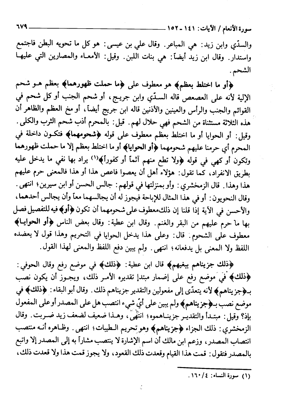 وَقَالَ النَّحْوِيُّونَ: أَوْ فِي هَذَا الْمِثَالِ لِلْإِبَاحَةِ فَيَجُوزُ لَهُ أَنْ يُجَالِسَهُمَا مَعًا وَأَنْ يُجَالِسَ أَحَدَهُمَا، وَالْأَحْسَنُ فِي الْآيَةِ إِذَا قُلْنَا إِنَّ ذَلِكَ مَعْطُوفٌ عَلَى شُحُومَهُمَا أَنْ تَكُونَ أَوِ فِيهِ لِلتَّفْصِيلِ فَصَلَ بِهَا ما حرم عليهم من الْبَقَرِ وَالْغَنَمِ. وَقَالَ ابْنُ عَطِيَّةَ: وَقَالَ بَعْضُ النَّاسِ أَوِ الْحَوايا مَعْطُوفٌ عَلَى الشُّحُومِ. قَالَ: وَعَلَى هَذَا يَدْخُلُ الْحَوَايَا فِي التَّحْرِيمِ وَهَذَا قَوْلٌ لَا يُعَضِّدُهُ اللَّفْظُ وَلَا الْمَعْنَى بَلْ يَدْفَعَانِهِ انْتَهَى. وَلَمْ يُبَيِّنْ دَفْعَ اللَّفْظِ وَالْمَعْنَى لِهَذَا الْقَوْلِ.