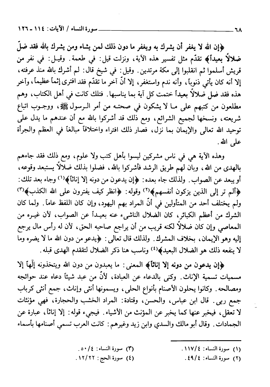 إِنَّ اللَّهَ لَا يَغْفِرُ أَنْ يُشْرَكَ بِهِ وَيَغْفِرُ مَا دُونَ ذلِكَ لِمَنْ يَشاءُ وَمَنْ يُشْرِكْ بِاللَّهِ فَقَدْ ضَلَّ ضَلالًا بَعِيداً تَقَدَّمَ مِثْلُ تَفْسِيرِ هَذِهِ الْآيَةِ، وَنَزَلَتْ قِيلَ: فِي طُعْمَةَ. وَقِيلَ: فِي نَفَرٍ مِنْ قُرَيْشٍ أَسْلَمُوا ثُمَّ انْقَلَبُوا إِلَى مَكَّةَ مُرْتَدِّينَ. وَقِيلَ: فِي شَيْخٍ قَالَ: لَمْ أُشْرِكْ بِاللَّهِ مُنْذُ عَرَفْتُهُ، إِلَّا أَنَّهُ كَانَ يَأْتِي ذُنُوبًا، وَأَنَّهُ نَدِمَ وَاسْتَغْفَرَ، إِلَّا أَنَّ آخِرَ مَا تَقَدَّمَ فَقَدِ افْتَرَى إِثْمًا عَظِيمًا، وَآخِرُ هَذِهِ فَقَدْ ضَلَّ ضَلَالًا بَعِيدًا خُتِمَتْ كُلُّ آيَةٍ بِمَا يُنَاسِبُهَا. فَتِلْكَ كَانَتْ فِي أَهْلِ الْكِتَابِ، وَهُمْ مُطَّلِعُونَ مِنْ كُتُبِهِمْ عَلَى مَا لَا يَشُكُّونَ فِي صِحَّتِهِ من أمر الرسول صلى الله عليه وسلم، وَوُجُوبِ اتِّبَاعِ شَرِيعَتِهِ، وَنَسْخِهَا لِجَمِيعِ الشَّرَائِعِ، وَمَعَ ذَلِكَ قَدْ أَشْرَكُوا بِاللَّهِ مَعَ أَنَّ عِنْدَهُمْ مَا يَدُلُّ عَلَى تَوْحِيدِ اللَّهِ تَعَالَى وَالْإِيمَانِ بِمَا نَزَلَ، فَصَارَ ذلك افتراء واختلاقا مُبَالَغًا فِي الْعِظَمِ وَالْجُرْأَةُ عَلَى اللَّهِ.