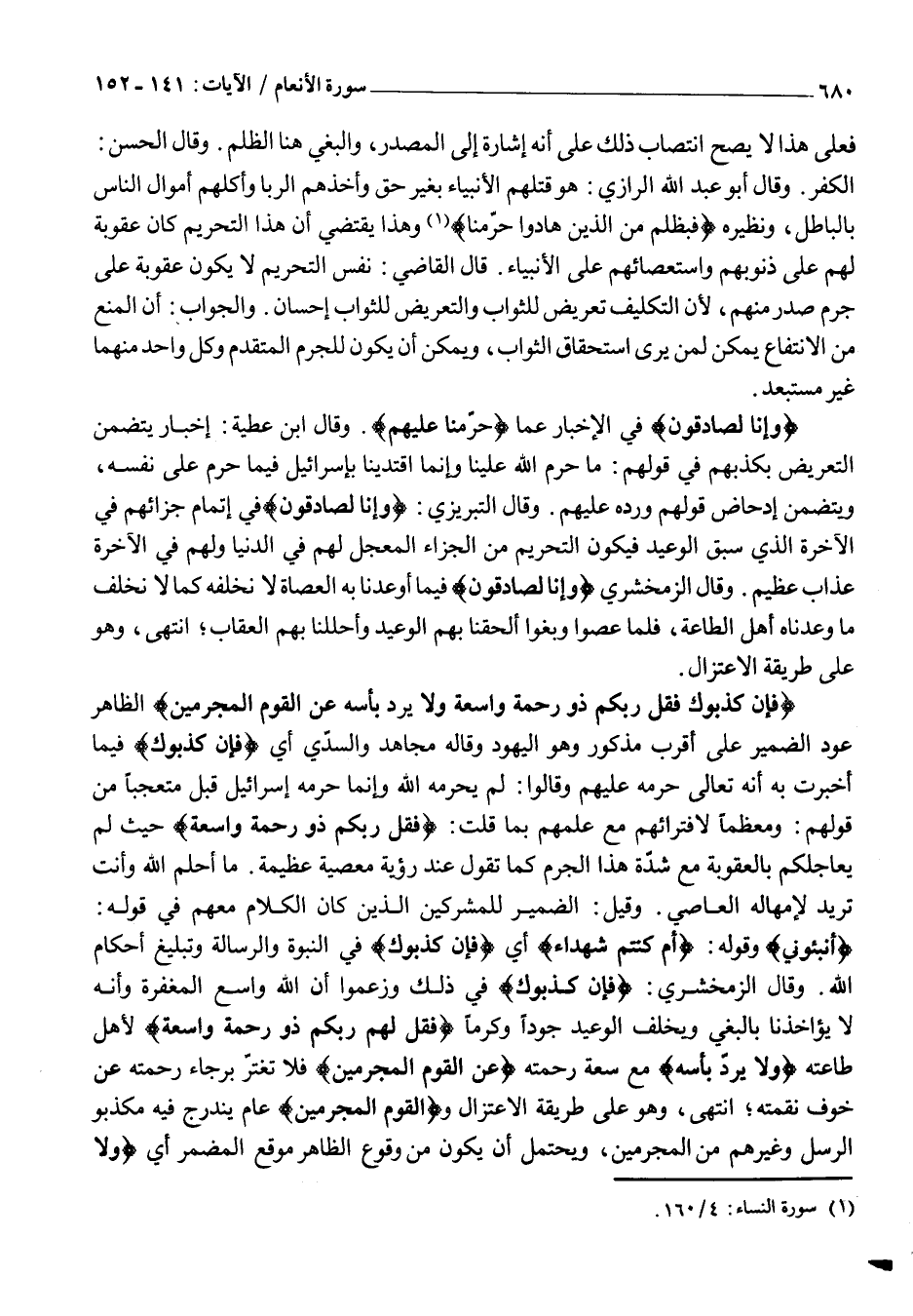 وَإِنَّا لَصادِقُونَ فِي الْإِخْبَارِ عَمَّا حَرَّمْنا عَلَيْهِمْ. وَقَالَ ابْنُ عَطِيَّةَ: إِخْبَارٌ يَتَضَمَّنُ التَّعْرِيضَ بِكَذِبِهِمْ فِي قَوْلِهِمْ: مَا حَرَّمَ اللَّهُ عَلَيْنَا وَإِنَّمَا اقْتَدَيْنَا بِإِسْرَائِيلَ فِيمَا حَرَّمَ عَلَى نَفْسِهِ، وَيَتَضَمَّنُ إِدْحَاضَ قَوْلِهِمْ وَرَدَّهُ عَلَيْهِمْ. وَقَالَ التِّبْرِيزِيُّ: وَإِنَّا لَصادِقُونَ فِي إِتْمَامِ جَزَائِهِمْ فِي الْآخِرَةِ الَّذِي سَبَقَ الْوَعِيدَ فَيَكُونُ التَّحْرِيمُ مِنَ الْجَزَاءِ الْمُعَجَّلِ لَهُمْ فِي الدُّنْيَا وَلَهُمْ فِي الْآخِرَةِ عَذَابٌ عَظِيمٌ. وَقَالَ الزَّمَخْشَرِيُّ وَإِنَّا لَصادِقُونَ فِيمَا أَوْعَدْنَا بِهِ الْعُصَاةَ لَا نُخْلِفُهُ كَمَا لَا نُخْلِفُ مَا وَعَدْنَاهُ أَهْلَ الطَّاعَةِ، فَلَمَّا عَصَوْا وَبَغَوْا أَلْحَقْنَا بِهِمُ الْوَعِيدَ وَأَحْلَلْنَا بِهِمُ الْعِقَابَ انْتَهَى، وَهُوَ عَلَى طَرِيقَةِ الِاعْتِزَالِ.