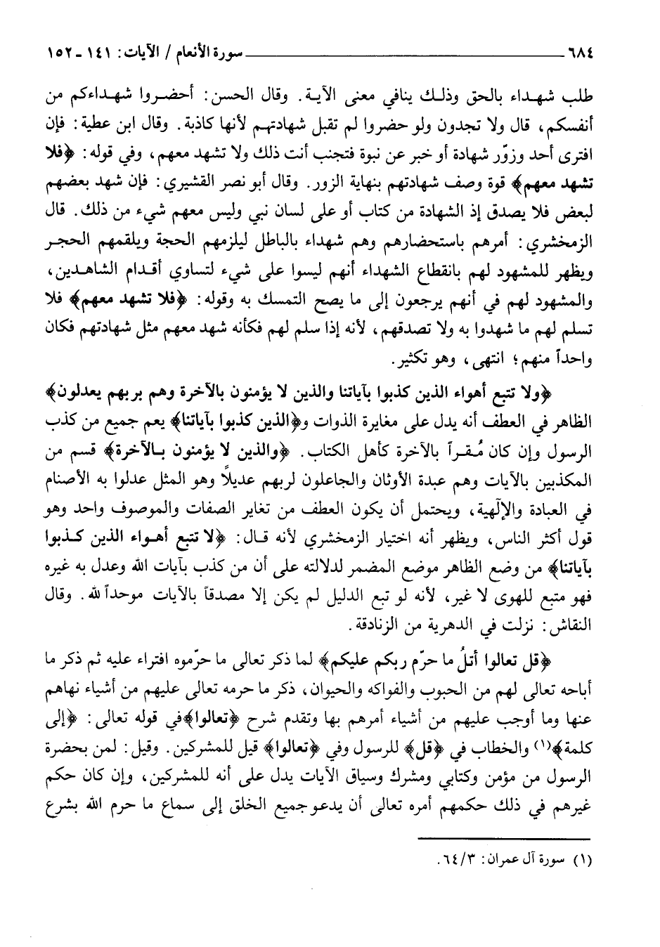 قُلْ تَعالَوْا أَتْلُ مَا حَرَّمَ رَبُّكُمْ عَلَيْكُمْ لَمَّا ذَكَرَ تَعَالَى مَا حَرَّمُوهُ افْتِرَاءً عَلَيْهِ ثُمَّ ذَكَرَ مَا أَبَاحَهُ تَعَالَى لَهُمْ مِنَ الْحُبُوبِ وَالْفَوَاكِهِ وَالْحَيَوَانِ، ذَكَرَ مَا حَرَّمَهُ تَعَالَى عَلَيْهِمْ مِنْ أَشْيَاءَ نَهَاهُمْ عَنْهَا وَمَا أَوْجَبَ عَلَيْهِمْ مِنْ أَشْيَاءَ أَمَرَهُمْ بِهَا وَتَقَدَّمَ شَرْحُ تَعالَوْا فِي قَوْلِهِ تَعَالَى: إِلى كَلِمَةٍ «1» وَالْخِطَابُ فِي قُلْ لِلرَّسُولِ وَفِي تَعالَوْا قِيلَ لِلْمُشْرِكِينَ. وَقِيلَ: لِمَنْ بِحَضْرَةِ الرَّسُولِ مِنْ مُؤْمِنٍ وَكِتَابِيٍّ وَمُشْرِكٍ وَسِيَاقُ الْآيَاتِ يَدُلُّ عَلَى أَنَّهُ لِلْمُشْرِكِينَ، وَإِنْ كَانَ حُكْمُ غَيْرِهِمْ فِي ذَلِكَ حُكْمَهُمْ أَمَرَهُ تَعَالَى أَنْ يَدْعُوَ جَمِيعَ الْخَلْقِ إِلَى سَمَاعِ مَا حَرَّمَ اللَّهُ بِشَرْعِ