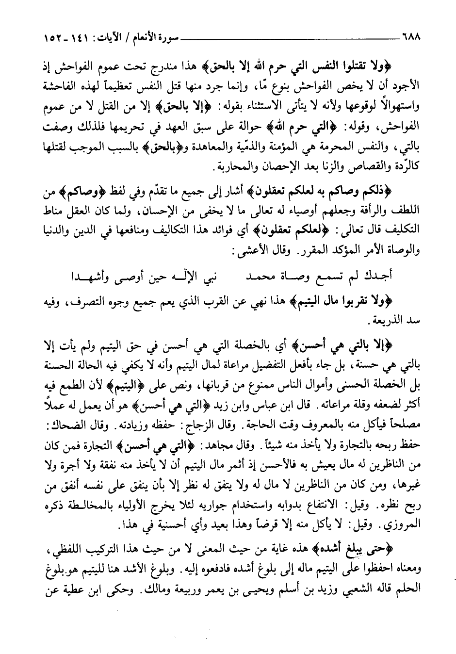 وَلا تَقْتُلُوا النَّفْسَ الَّتِي حَرَّمَ اللَّهُ إِلَّا بِالْحَقِّ هَذَا مُنْدَرِجٌ تَحْتَ عُمُومِ الْفَوَاحِشِ إِذِ الْأَجْوَدُ أَنْ لَا يَخُصَّ الْفَوَاحِشَ بِنَوْعٍ مَا، وَإِنَّمَا جَرَّدَ مِنْهَا قَتْلَ النَّفْسِ تَعْظِيمًا لِهَذِهِ الْفَاحِشَةِ وَاسْتِهْوَالًا لِوُقُوعِهَا وَلِأَنَّهُ لَا يَتَأَتَّى الِاسْتِثْنَاءُ بِقَوْلِهِ: إِلَّا بِالْحَقِّ إِلَّا مِنَ الْقَتْلِ لَا مِنْ عُمُومِ الْفَوَاحِشِ، وَقَوْلُهُ: الَّتِي حَرَّمَ اللَّهُ حَوَالَةٌ عَلَى سَبْقِ الْعَهْدِ فِي تَحْرِيمِهَا فَلِذَلِكَ وُصِفَتْ بِالَّتِي، وَالنَّفْسُ الْمُحَرَّمَةُ هِيَ الْمُؤْمِنَةُ وَالذِّمِّيَّةُ وَالْمُعَاهَدَةُ وبِالْحَقِّ بِالسَّبَبِ الْمُوجِبِ لِقَتْلِهَا كَالرِّدَّةِ وَالْقِصَاصِ وَالزِّنَا بَعْدَ الْإِحْصَانِ وَالْمُحَارَبَةِ.