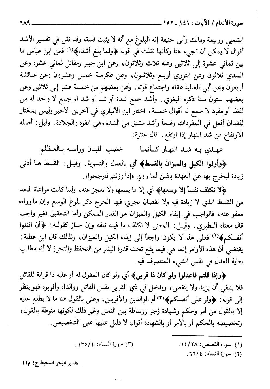 الشَّعْبِيِّ وَرَبِيعَةَ وَمَالِكٍ وَأَبِي حَنِيفَةَ إِنَّهُ الْبُلُوغُ مَعَ أَنَّهُ لَا يَثْبُتُ فِسْقُهُ وَقَدْ نُقِلَ فِي تَفْسِيرِ الْأَشُدِّ أَقْوَالٌ لَا يُمْكِنُ أَنْ تَجِيءَ هُنَا وَكَأَنَّهَا نُقِلَتْ فِي قَوْلِهِ وَلَمَّا بَلَغَ أَشُدَّهُ «1» فَعَنِ ابْنِ عَبَّاسٍ مَا بَيْنَ ثَمَانِيَ عَشْرَةَ إِلَى ثَلَاثِينَ وَعَنْهُ ثَلَاثٌ وَثَلَاثُونَ، وَعَنِ ابْنِ جُبَيْرٍ وَمُقَاتِلٍ ثَمَانِيَ عَشْرَةَ وَعَنِ السُّدِّيِّ ثَلَاثُونَ وَعَنِ الثَّوْرِيِّ أَرْبَعٌ وَثَلَاثُونَ، وَعَنْ عِكْرِمَةَ خَمْسٌ وَعِشْرُونَ وَعَنْ عَائِشَةَ أَرْبَعُونَ وَعَنْ أَبِي الْعَالِيَةِ عَقْلُهُ وَاجْتِمَاعُ قُوَّتِهِ، وَعَنْ بَعْضِهِمْ مِنْ خَمْسَةَ عَشَرَ إِلَى ثَلَاثِينَ وَعَنْ بَعْضِهِمْ سِتُّونَ سَنَةً ذَكَرَهُ الْبَغَوِيُّ. وَأَشُدُّ جَمْعُ شِدَّةٍ أَوْ شَدٍّ أَوْ شُدٍّ أَوْ جَمْعٌ لَا وَاحِدَ لَهُ مِنْ لَفْظِهِ أَوْ مُفْرَدٌ لَا جَمْعَ لَهُ أَقْوَالٌ خَمْسَةٌ، اخْتَارَ ابْنُ الْأَنْبَارِيِّ فِي آخَرِينَ الْأَخِيرَ وَلَيْسَ بِمُخْتَارٍ لِفِقْدَانِ أَفْعَلَ فِي الْمُفْرَدَاتِ وَضْعًا وَأَشُدُّ مُشْتَقٌّ مِنَ الشِّدَّةِ وَهِيَ الْقُوَّةُ وَالْجَلَّادَةُ. وَقِيلَ: أَصْلُهُ الِارْتِفَاعُ مَنْ شَدَّ النَّهَارُ إِذَا ارْتَفَعَ. قَالَ عَنْتَرَةُ: