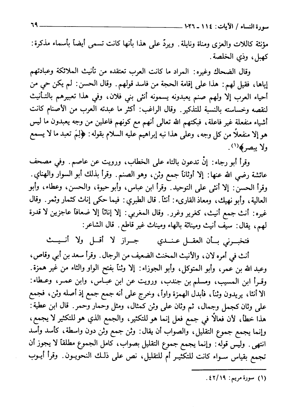 وَقَالَ الضَّحَّاكُ وَغَيْرُهُ: الْمُرَادُ مَا كَانَتِ الْعَرَبُ تَعْتَقِدُهُ مِنْ تَأْنِيثِ الْمَلَائِكَةِ وَعِبَادَتِهِمْ إِيَّاهَا، فَقِيلَ لَهُمْ: هَذَا عَلَى إِقَامَةِ الْحُجَّةِ مِنْ فَاسِدِ قَوْلِهِمْ. وَقَالَ الْحَسَنُ: لَمْ يَكُنْ حَيٌّ مِنْ أَحْيَاءِ الْعَرَبِ إِلَّا وَلَهُمْ صَنَمٌ يَعْبُدُونَهُ يُسَمُّونَهُ أُنْثَى بَنِي فُلَانٍ، وَفِي هَذَا تَعْبِيرُهُمْ بِالتَّأْنِيثِ لِنَقْصِهِ وَخَسَاسَتِهِ بِالنِّسْبَةِ لِلتَّذْكِيرِ. وَقَالَ الرَّاغِبُ: أَكْثَرُ مَا عَبَدَتْهُ الْعَرَبُ مِنَ الْأَصْنَامِ كَانَتْ أَشْيَاءَ مُنْفَعِلَةً غَيْرَ فَاعِلَةٍ، فَبَكَّتْهُمُ اللَّهُ تَعَالَى أَنَّهُمْ مَعَ كَوْنِهِمْ فَاعِلِينَ مِنْ وَجْهٍ يَعْبُدُونَ مَا لَيْسَ هُوَ إِلَّا مُنْفَعِلًا مِنْ كُلِّ وَجْهٍ، وَعَلَى هَذَا نَبَّهَ إِبْرَاهِيمُ عَلَيْهِ السَّلَامُ بِقَوْلِهِ: لِمَ تَعْبُدُ مَا لَا يَسْمَعُ وَلا يُبْصِرُ