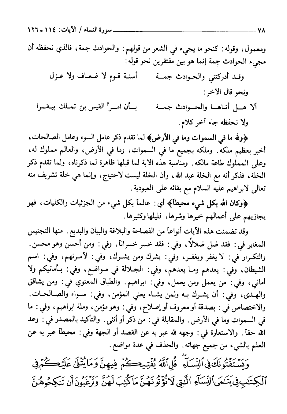 وَالِاخْتِصَاصُ فِي: بِصَدَقَةٍ أَوْ مَعْرُوفٍ أَوْ إِصْلَاحٍ، وَفِي: وهو مؤمن، وملة إِبْرَاهِيمَ، وَفِي: مَا فِي السموات وَمَا فِي الْأَرْضِ. وَالْمُقَابَلَةُ فِي: مِنْ ذَكَرٍ أَوْ أُنْثَى. وَالتَّأْكِيدُ بِالْمَصْدَرِ فِي: وَعْدَ اللَّهِ حَقًّا. وَالِاسْتِعَارَةُ فِي: وَجْهَهُ لِلَّهِ عَبَّرَ بِهِ عَنِ الْقَصْدِ أَوِ الْجِهَةِ وَفِي: مُحِيطًا عَبَّرَ بِهِ عَنِ الْعِلْمِ بِالشَّيْءِ مِنْ جَمِيعِ جِهَاتِهِ. وَالْحَذْفُ فِي عِدَّةِ مَوَاضِعَ.