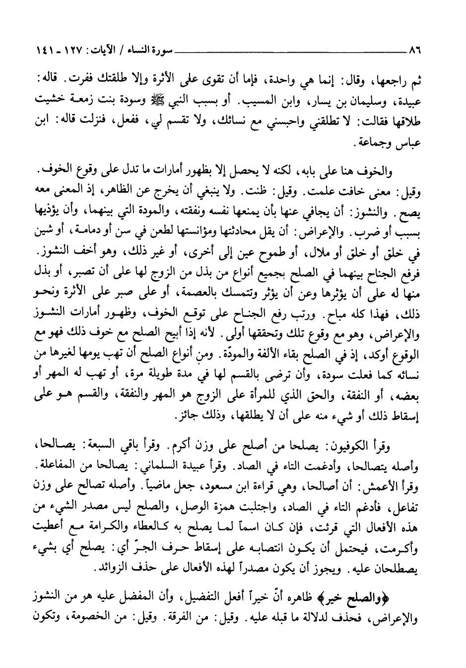 عُبَيْدَةُ، وَسُلَيْمَانُ بْنُ يَسَارٍ، وَابْنُ الْمُسَيَّبِ. أَوْ بِسَبَبِ النَّبِيِّ صَلَّى اللَّهُ عَلَيْهِ وَسَلَّمَ وَسَوْدَةَ بِنْتِ زَمْعَةَ خَشِيَتْ طَلَاقَهَا فَقَالَتْ: لَا تُطَلِّقْنِي وَاحْبِسْنِي مَعَ نِسَائِكَ، وَلَا تَقْسِمْ لِي، فَفَعَلَ، فَنَزَلَتْ قَالَهُ: ابْنُ عَبَّاسٍ وَجَمَاعَةٌ.