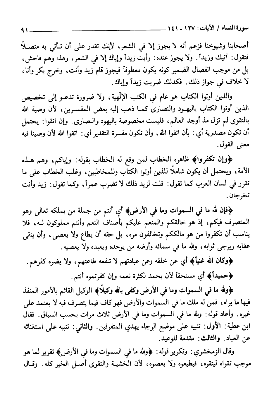 وَإِنْ تَكْفُرُوا ظَاهِرُهُ الْخِطَابُ لِمَنْ وَقَعَ لَهُ الْخِطَابُ بِقَوْلِهِ: وَإِيَّاكُمْ، وَهُمْ هَذِهِ الْأُمَّةُ، وَيُحْتَمَلُ أَنْ يَكُونَ شَامِلًا لِلَّذِينِ أُوتُوا الْكِتَابَ وَلِلْمُخَاطَبِينَ، وَغَلَبَ الْخِطَابُ عَلَى مَا تَقَرَّرَ فِي لِسَانِ الْعَرَبِ كَمَا تَقُولُ: قُلْتُ لِزَيْدٍ ذَلِكَ لَا تَضْرِبْ عَمْرًا، وَكَمَا تَقُولُ: زَيْدٌ وَأَنْتَ تَخْرُجَانِ.