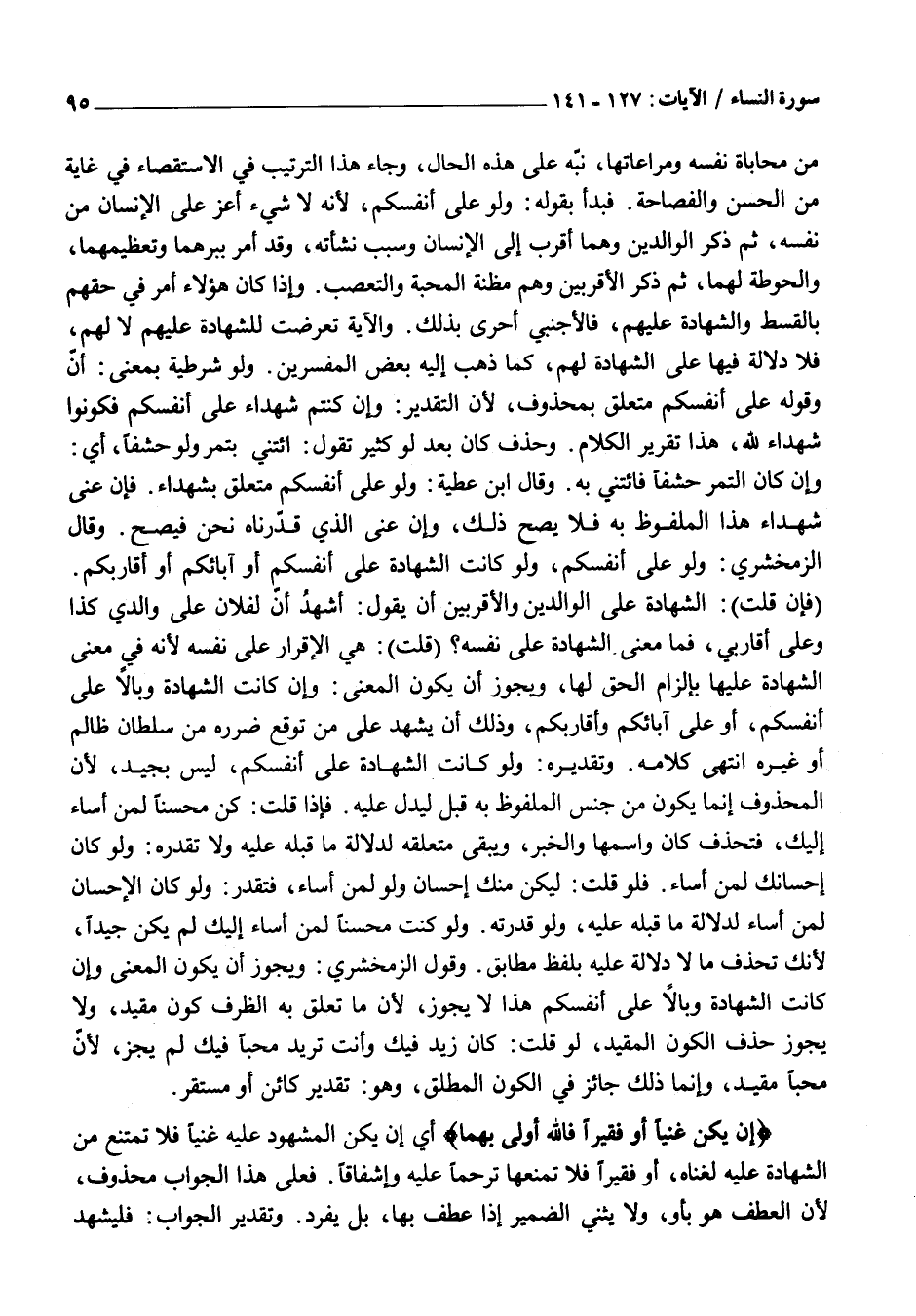 مِنْ مُحَابَاةِ نَفْسِهِ وَمُرَاعَاتِهَا، نَبَّهَ عَلَى هَذِهِ الْحَالِ، وَجَاءَ هَذَا التَّرْتِيبُ فِي الِاسْتِقْصَاءِ فِي غَايَةٍ مِنَ الْحُسْنِ وَالْفَصَاحَةِ. فَبَدَأَ بِقَوْلِهِ: وَلَوْ عَلَى أَنْفُسِكُمْ، لِأَنَّهُ لَا شَيْءَ أَعَزُّ عَلَى الْإِنْسَانِ مِنْ نَفْسِهِ، ثُمَّ ذَكَرَ الْوَالِدَيْنِ وَهُمَا أَقْرَبُ إِلَى الْإِنْسَانِ وَسَبَبُ نَشْأَتِهِ، وَقَدْ أَمَرَ بِبِرِّهِمَا وَتَعْظِيمِهِمَا، وَالْحَوْطَةِ لَهُمَا، ثُمَّ ذَكَرَ الْأَقْرَبِينَ وَهُمْ مَظِنَّةُ الْمَحَبَّةِ وَالتَّعَصُّبِ. وَإِذَا كَانَ هَؤُلَاءِ أُمِرَ فِي حَقِّهِمْ بِالْقِسْطِ وَالشَّهَادَةِ عَلَيْهِمْ، فَالْأَجْنَبِيُّ أَحْرَى بِذَلِكَ. وَالْآيَةُ تَعَرَّضَتْ لِلشَّهَادَةِ عَلَيْهِمْ لَا لَهُمْ، فَلَا دَلَالَةَ فِيهَا عَلَى الشَّهَادَةِ لَهُمْ، كَمَا ذَهَبَ إِلَيْهِ بَعْضُ الْمُفَسِّرِينَ. وَلَوْ شَرْطِيَّةٌ بِمَعْنَى: إِنْ وَقَوْلُهُ عَلَى أَنْفُسِكُمْ مُتَعَلِّقٍ بِمَحْذُوفٍ، لِأَنَّ التَّقْدِيرَ: وَإِنْ كُنْتُمْ شُهَدَاءَ عَلَى أَنْفُسِكُمْ فَكُونُوا شُهَدَاءَ لِلَّهِ، هَذَا تَقْرِيرُ الْكَلَامِ. وَحَذْفُ كَانَ بَعْدَ لَوْ كَثِيرٌ تَقُولُ: ائْتِنِي بِتَمْرٍ وَلَوْ حَشَفًا، أَيْ:
