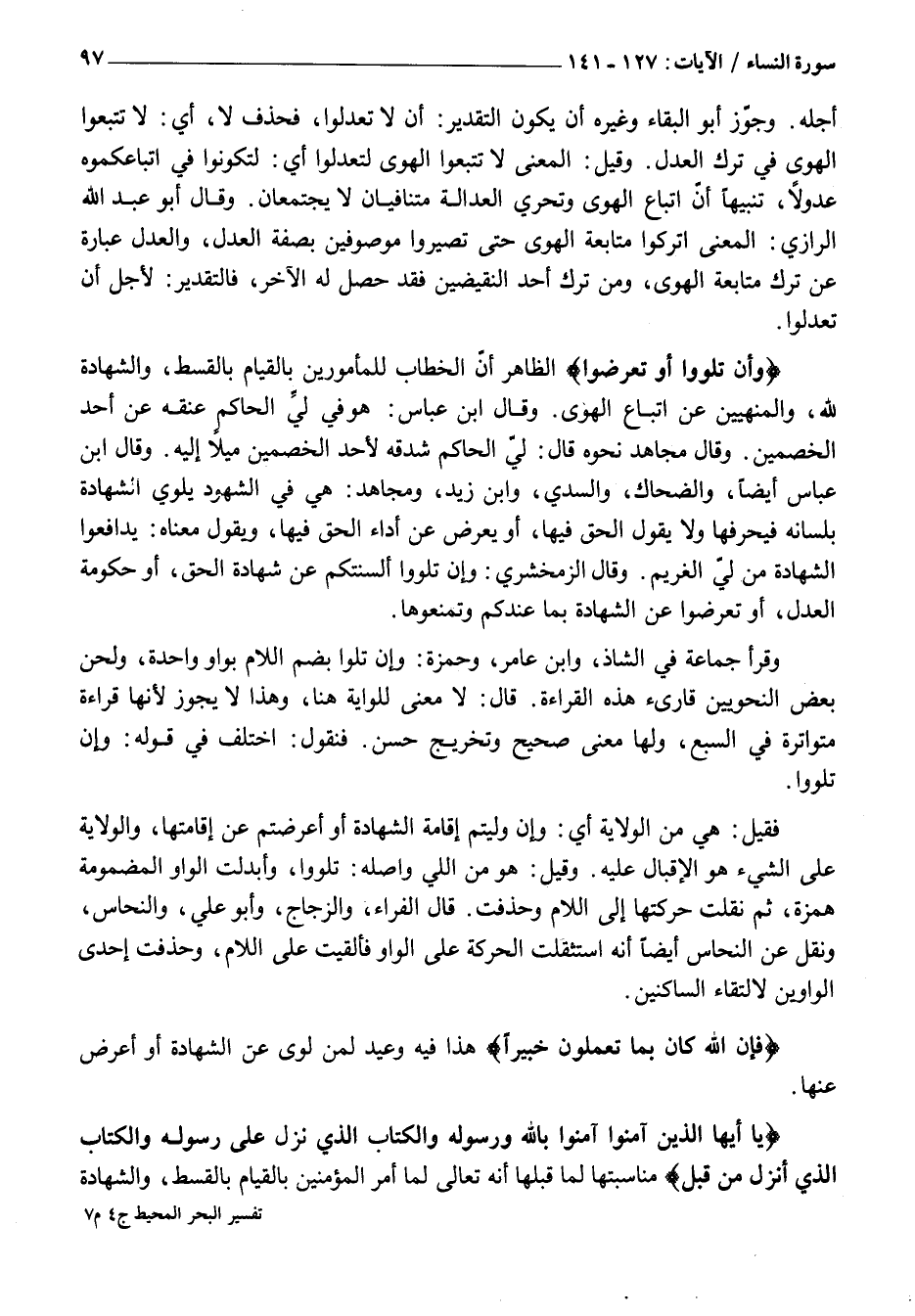 وَإِنْ تَلْوُوا أَوْ تُعْرِضُوا الظَّاهِرُ أَنَّ الْخِطَابَ لِلْمَأْمُورِينَ بِالْقِيَامِ بِالْقِسْطِ، وَالشَّهَادَةِ لِلَّهِ، وَالْمَنْهِيِّينَ عَنِ اتِّبَاعِ الْهَوَى. وَقَالَ ابْنُ عَبَّاسٍ: هُوَ فِي لَيِّ الْحَاكِمِ عُنُقَهُ عَنْ أَحَدِ الْخَصْمَيْنِ. وَقَالَ مُجَاهِدٌ نَحْوَهُ قَالَ: لَيُّ الْحَاكِمِ شِدْقَهُ لِأَحَدِ الْخَصْمَيْنِ مَيْلًا إِلَيْهِ. وَقَالَ ابْنُ عَبَّاسٍ أَيْضًا، وَالضَّحَّاكُ، وَالسُّدِّيُّ، وَابْنُ زَيْدٍ، وَمُجَاهِدٌ: هِيَ فِي الشُّهُودِ يَلْوِي الشَّهَادَةَ بِلِسَانِهِ فَيُحَرِّفُهَا وَلَا يَقُولُ الْحَقَّ فِيهَا، أَوْ يُعْرِضُ عَنْ أَدَاءِ الْحَقِّ فِيهَا، وَيَقُولُ مَعْنَاهُ: يُدَافِعُوا الشَّهَادَةَ مِنْ لَيِّ الْغَرِيمِ. وَقَالَ الزَّمَخْشَرِيُّ: وَإِنْ تَلْوُوا أَلْسِنَتَكُمْ عَنْ شَهَادَةِ الْحَقِّ، أَوْ حُكُومَةِ الْعَدْلِ، أَوْ تُعْرِضُوا عَنِ الشَّهَادَةِ بِمَا عِنْدَكُمْ وَتَمْنَعُوهَا.