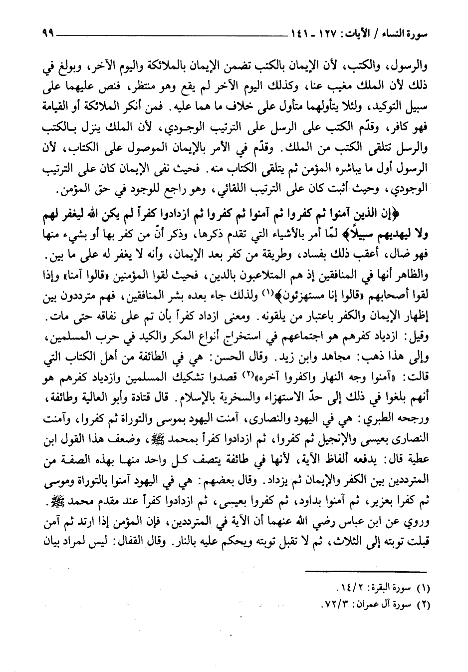 إِنَّ الَّذِينَ آمَنُوا ثُمَّ كَفَرُوا ثُمَّ آمَنُوا ثُمَّ كَفَرُوا ثُمَّ ازْدادُوا كُفْراً لَمْ يَكُنِ اللَّهُ لِيَغْفِرَ لَهُمْ وَلا لِيَهْدِيَهُمْ سَبِيلًا لَمَّا أَمَرَ بِالْأَشْيَاءِ الَّتِي تَقَدَّمَ ذِكْرُهَا، وَذَكَرَ أَنَّ مَنْ كَفَرَ بِهَا أَوْ بِشَيْءٍ مِنْهَا فَهُوَ ضَالٌّ، أَعْقَبَ ذَلِكَ بِفَسَادٍ، وَطَرِيقَةِ مَنْ كَفَرَ بَعْدَ الْإِيمَانِ، وَأَنَّهُ لَا يَغْفِرُ لَهُ عَلَى مَا بَيَّنَ.