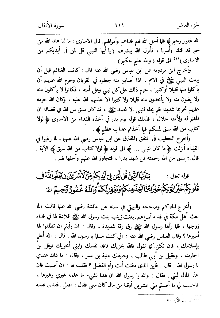 قَالَ الْأُسَارَى: مَا لنا عِنْد الله من خير قد قتلنَا وأسرنا فَأنْزل الله يبشرهم (يَا أَيهَا النَّبِي قل لمن فِي أَيْدِيكُم من الْأُسَارَى) (الْأَنْفَال الْآيَة 70) إِلَى قَوْله (وَالله عليم حَكِيم)